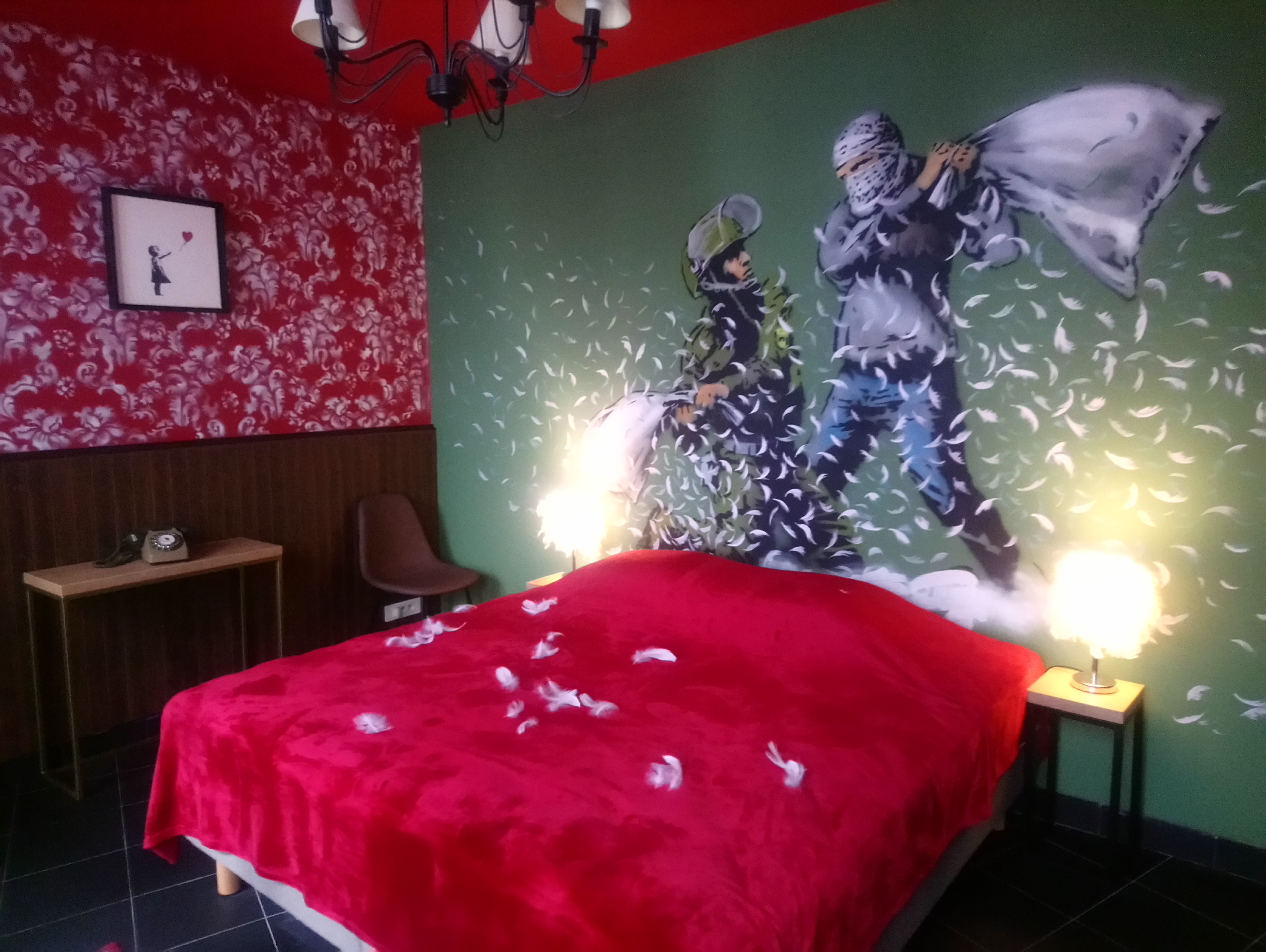 Nelle camere dell’albergo e nello spazio espositivo troviamo, tra gli altri, l’inevitabile Israeli and Palestinian Pillow Fight, perfettamente in tema, ma anche Kissing Coppers, Flying Copper o Girl with balloon, An englishman in Paris e il bellissimo Flower Thrower, oltre agli imperdibili topini e scimmiette. Ma attenzione! Infatti, come si può leggere sul sito ufficiale dell’artista britannico banksy.co.uk, l’iniziativa parigina, come altre 26 mostre a lui dedicate in altre parti del mondo, viene considerata un fake, ossia non approvata dall’artista. Contestate, amate, rubate, sovversive, umoristiche, non si può far a meno delle creazioni di Banksy, così anche se non autorizzate, queste esposizioni meritano pur sempre una visita.