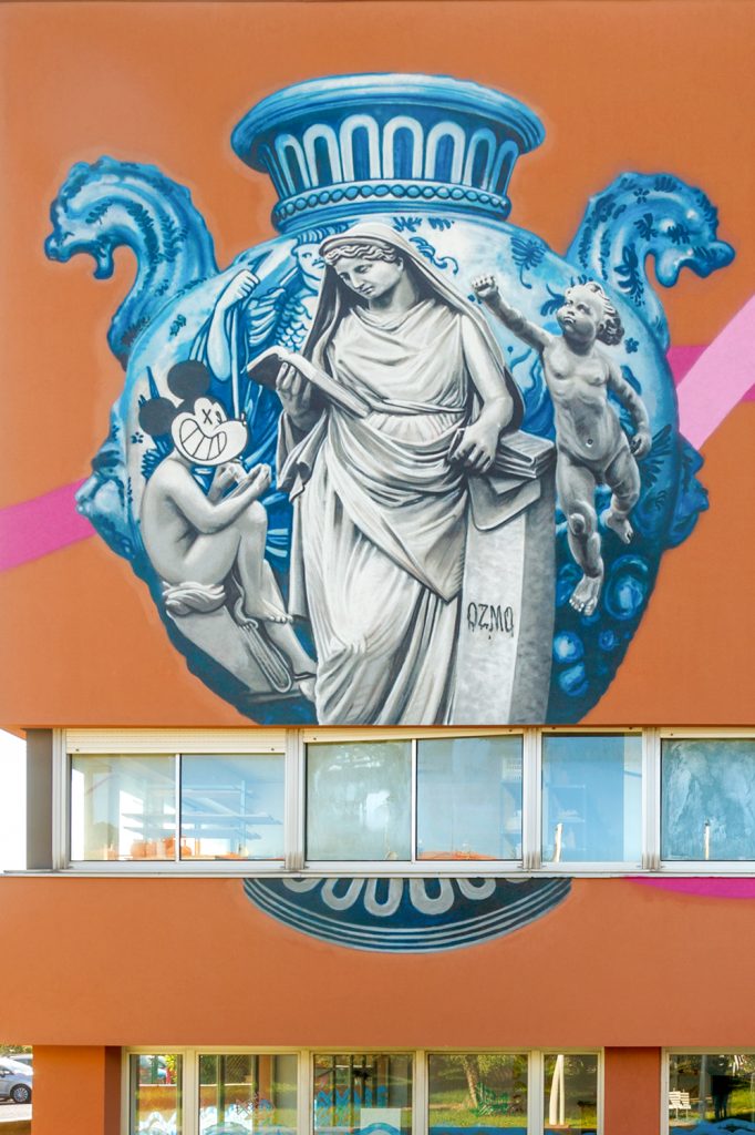 Per Ozmo che ha dipinto negli spazi pubblici delle principali capitali dell’arte urbana e contemporanea, si tratta del primo intervento artistico sulla parete di un edificio scolastico in Europa, dove ha sede peraltro anche l’unica Scuola comunale di ceramica in Italia. Per una duplice valenza storico-artistica racchiusa in un’opera autenticamente site specific e dedicata espressamente agli studenti, dal titolo …Back to school, Mickey Mouse!.