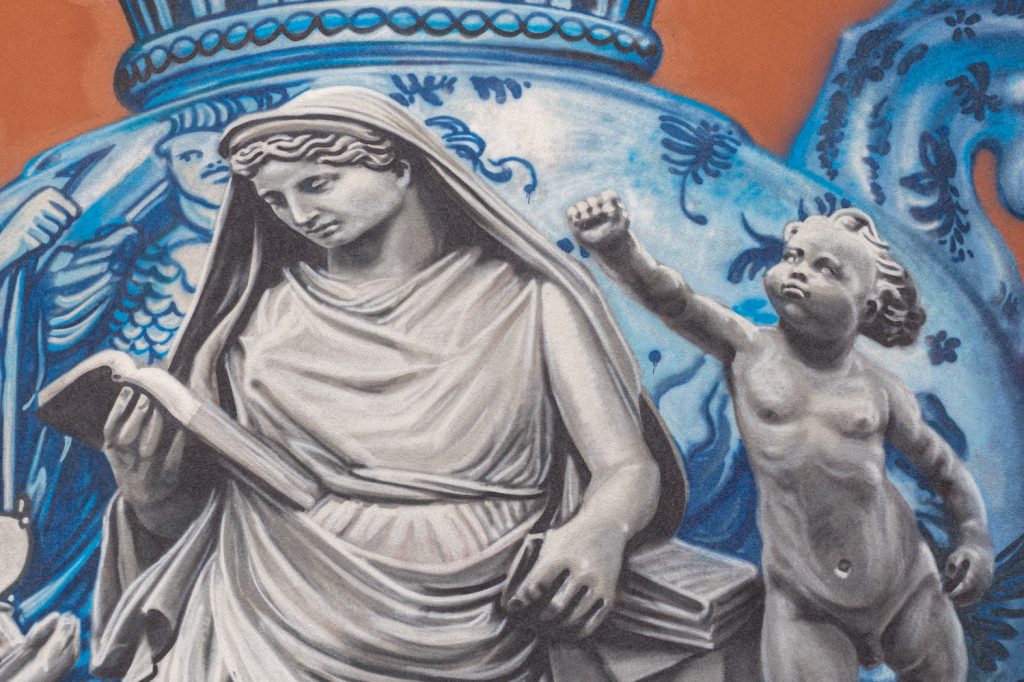 La scultura classica di una donna, assorta nella lettura, è dipinta fra due putti. Da un lato, quello del Verrocchio appare intento a raggiungere qualcosa e con la sua postura incoraggia a guardare in differenti prospettive; dall’altro, quello del Canova, assume le sembianze di un Topolino dal sorriso inusuale, provocando meraviglia e straniamento. L’innesto di opere ed elementi che creano cortocircuiti e letture ambivalenti caratterizza da sempre la ricerca e la produzione di Ozmo. Uno dei modi attraverso i quali l’artista ci interroga e interroga le immagini stesse.