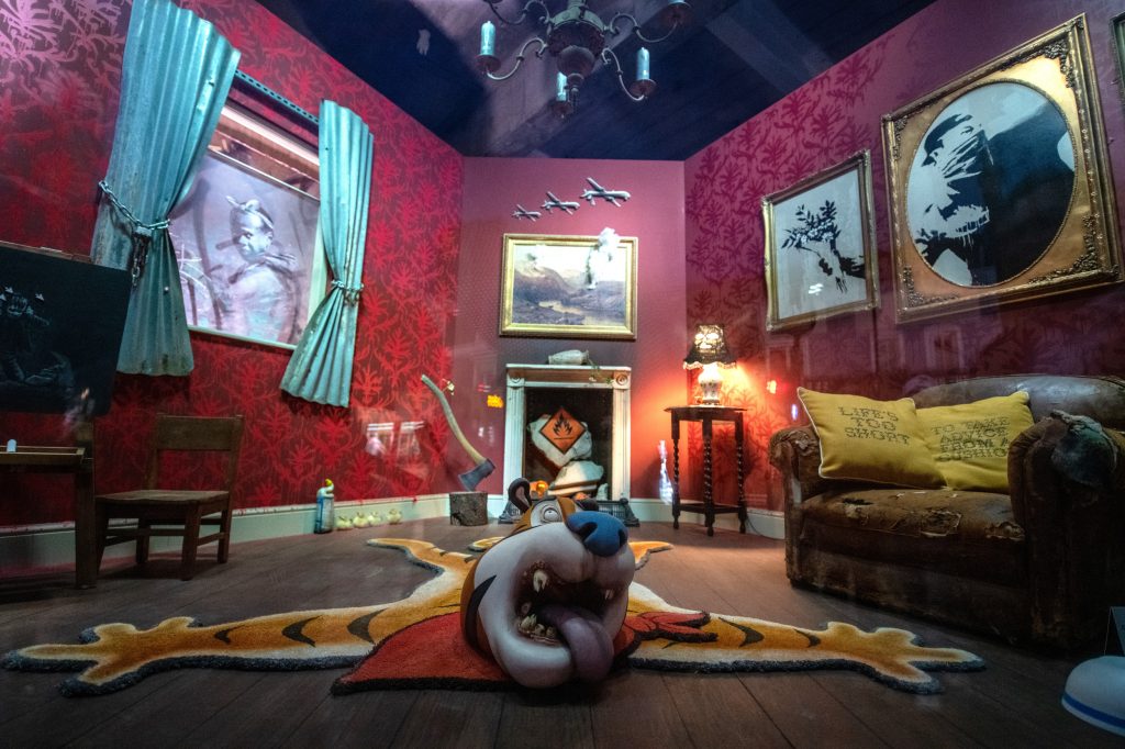 Il nuovo negozio di Banksy è peraltro ben conosciuto dagli abitanti di Londra, visto che ha occupato gli spazi di un vecchio magazzino di tappezzeria. Ma cosa si può comprare, in questo Gross Domestic Product? Ovviamente non grossolani accessori per la casa, come lascerebbe intendere l’insegna. In vendita, un tappeto ispirato a Tony the Tiger, la mascotte dei cereali Frosties di Kellogg, un elmetto da poliziotto a forma di sfera stroboscopica da discoteca – veramente un accessorio alla moda, tipo il giubbotto anti-lama per il rapper Stormyz – un camion da traporto migranti e poi tazze, piatti e t-shirt griffate con gli stencil più iconici di Banksy. Insomma, opere d’arte. E allora quel Gross Domestic Product non è un nome scelto a caso ma una provocazione in pieno stile banksyano, rivolta contro un certo modo fin troppo commerciale di intendere l’arte. E ancora tutt’altro che casuale è la concomitanza con Frieze London, una delle fiere più importanti del mondo.
