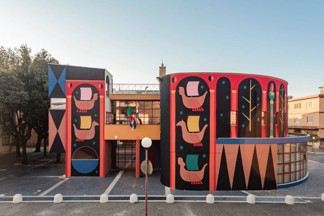 La biblioteca di Pomezia, già da tempo simbolo culturale di una cittadina piccola alle porte della Capitale, rinasce proprio da qui, con questo progetto di Agostino Iacurci che si intitola Antiporta. Non a caso l’artista pone l’Eneide e Virgilio al centro del proprio lavoro, perché in questi luoghi, in questi lidi, si dice che Enea sia sbarcato. Ecco dunque la citazione delle cento porte che portano all’oltretomba, la misteriosa porta in tufo dell’heroon conservata al Museo Archeologico di Lavinium, visitabile ancora oggi.