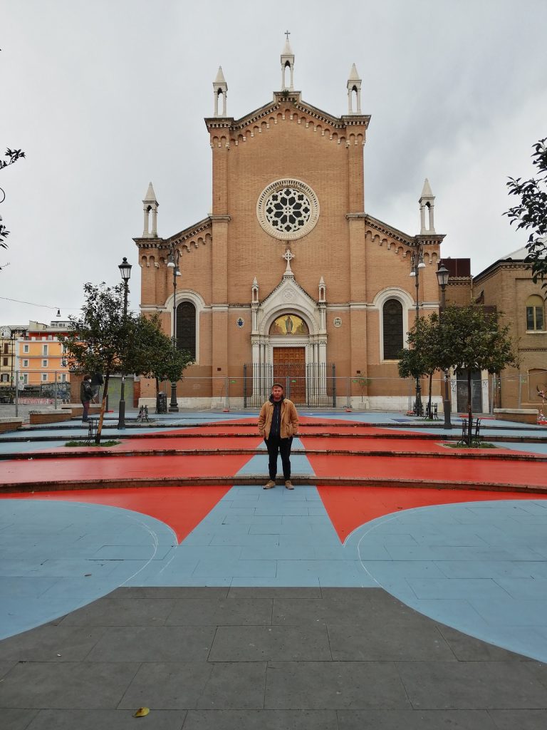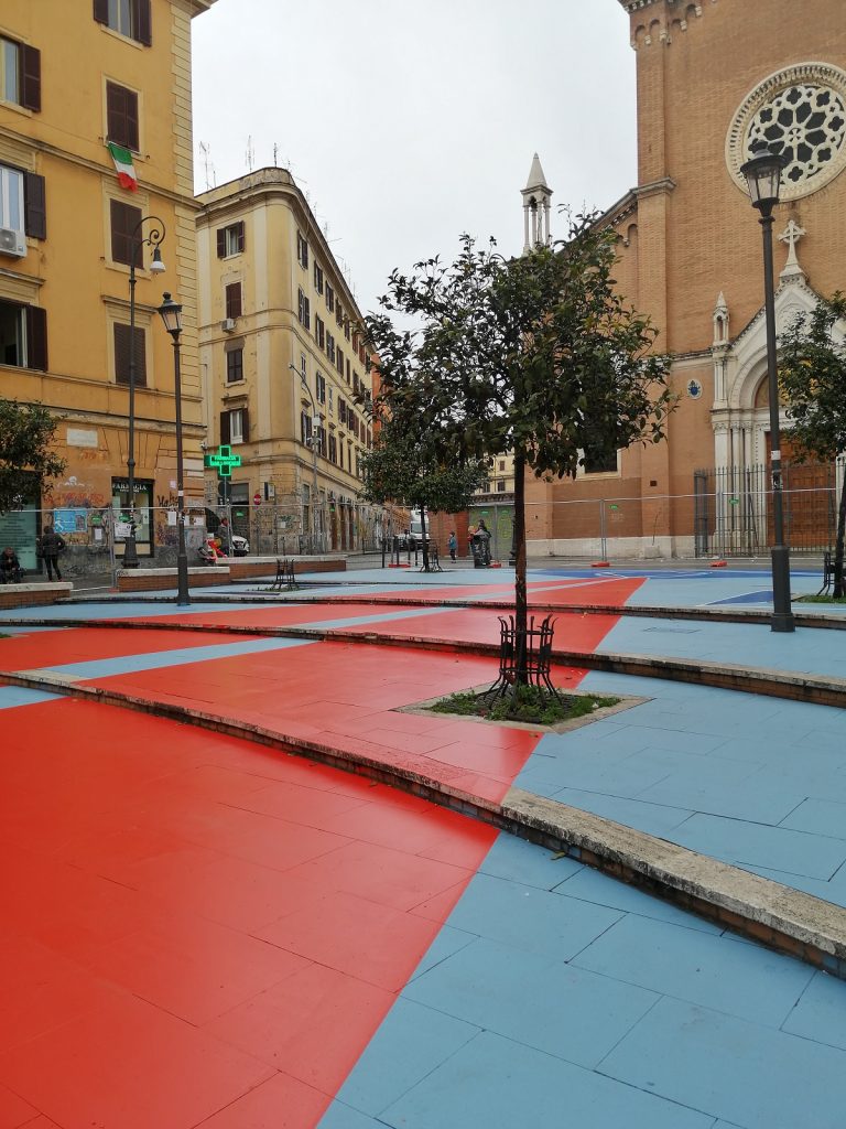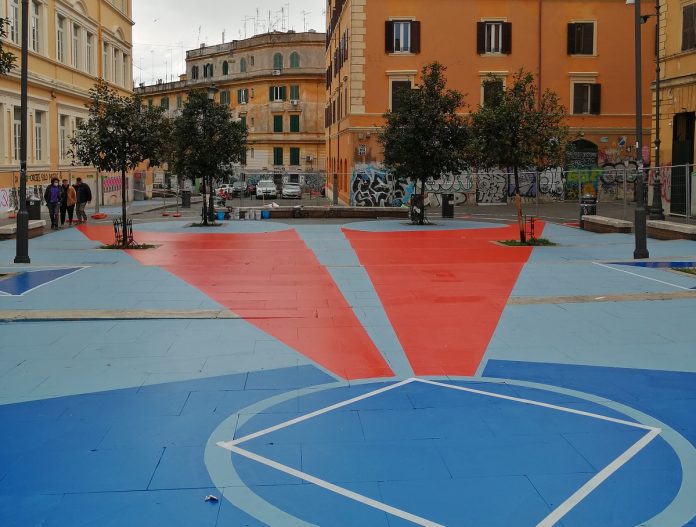 In fondo, è sempre una questione di spazio. Cioè di spazi da agire, da attraversare liberamente e con lo sguardo rivolto verso l’alto, spazi da vivere e immaginare, dove potersi fermare per un po’ di tempo, insieme o anche da soli. E, in questi ultimi tempi così ristretti, spazi di cui riappropriarsi. Magari misurandone le distanze con una palette di colori sgargianti, saltando a due piedi tra le geometrie rosse e blu, letteralmente e non solo con l’immaginazione, vista la concretezza “orizzontale” – un termine usato non senza una sfumatura metodologica, etica – di Fantasia in piazza, opera di Leonardo Crudi, a cura di Libera Repubblica di San Lorenzo e promossa dal Municipio Roma II, vincitrice dell’Avviso Pubblico Lazio Street Art, bandito dalla Regione Lazio.