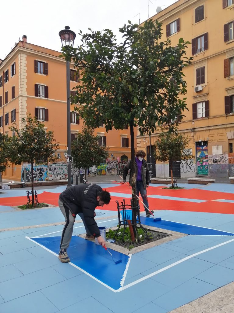 «La Libera Repubblica di San Lorenzo mette insieme realtà diverse ed è questa la sua forza», ci ha raccontato Emilia Giorgi, critica e curatrice, membro di questa rete informale di associazioni impegnate nel popolare e dinamico quartiere di Roma. Le strade sono parallele, tra spazi sociali, associazioni dedicate ai più piccoli e polisportive, come Communia, Esc Atelier, Nuovo Cinema Palazzo, ANPI San Lorenzo, Atletico San Lorenzo, Il Grande Cocomero, La Gru – Germogli di Rinascita Urbana. Ma lo scopo è trasversale: riattivare lo spazio e le relazioni che, in esso, circolano. «È sicuramente un progetto politico che lavora sul quartiere, per rivendicare i diritti allo spazio pubblico di tutte le fasce d’età», ha continuato Giorgi. «È un lavoro che portiamo avanti da anni e che, dopo l’emergenza Covid, è implementato in vari modi. Oggi, per una vita comune e in sicurezza, si avverte ancora di più la necessità di poter fruire di spazi all’aperto. Ma anche prima di partecipare al bando, avevamo già portato avanti varie operazioni informali di urbanismo tattico: per esempio, abbiamo iniziato a dipingere nelle zone più sensibili del quartiere anche senza autorizzazione», ha spiegato la curatrice.