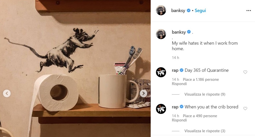 D’altra parte, non è certo colpa dei topi che, abituati a vagare liberamente nei sottosuoli delle metropoli, hanno dovuto adattarsi alla nuova situazione di confinamento forzato. Un po’ più semplice per Banksy, che non è nuovo a lavori di interior design, dal Walled Off Hotel di Gerusalemme al negozio a Londra. E la moglie? Non sappiamo se Banksy sia sposato o se conviva con qualcuno, anche se nella fotografia si vedono due spazzolini da denti. Ma un maniaco della precisione della scenografia come lui non avrebbe mai trascurato questo particolare rivelatore.