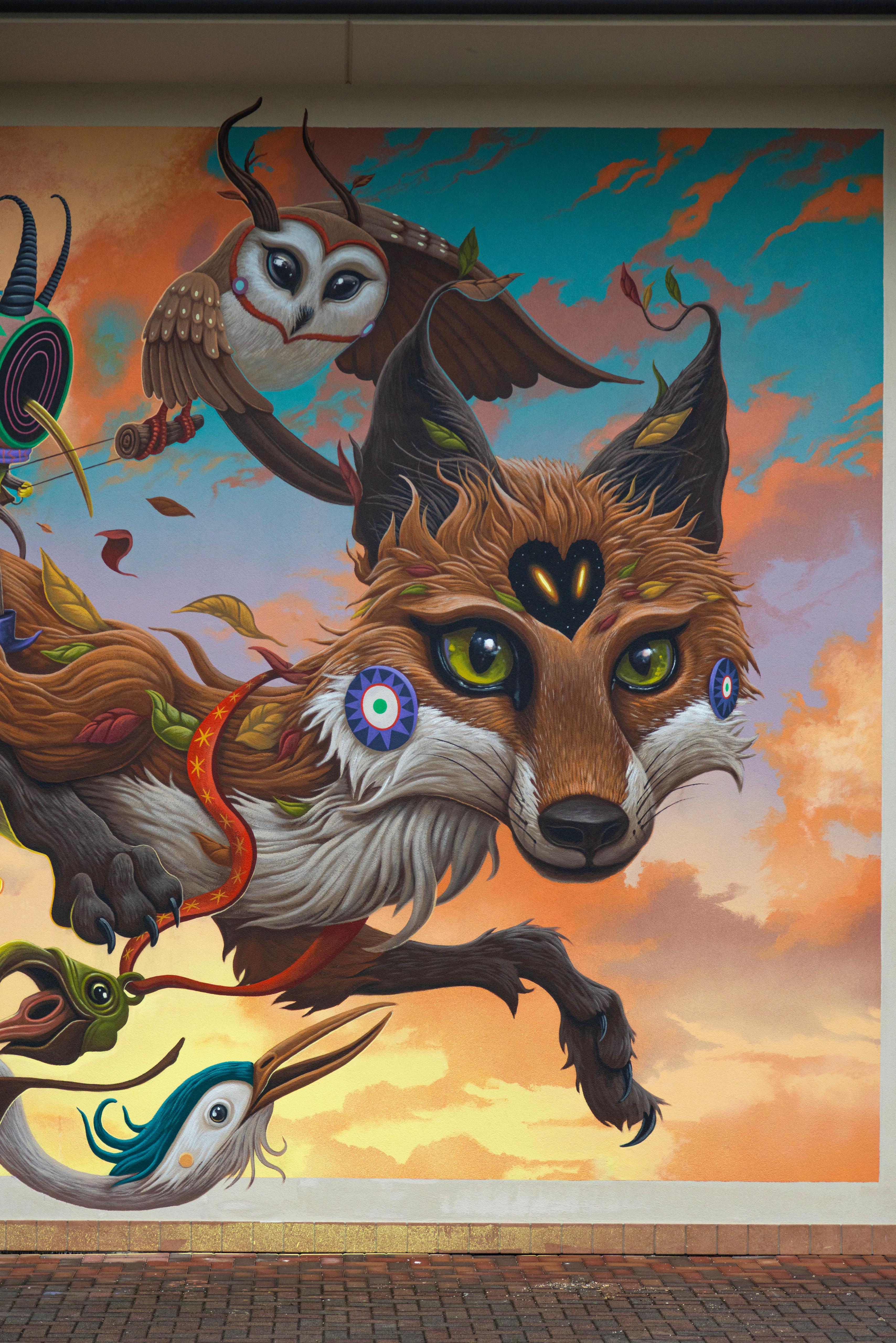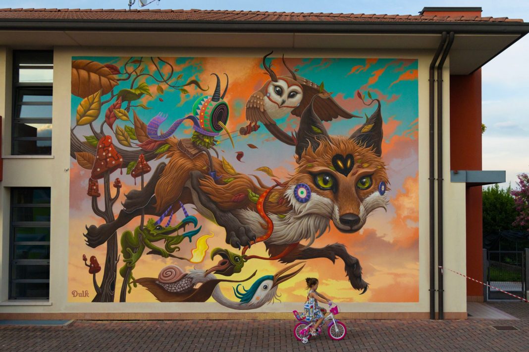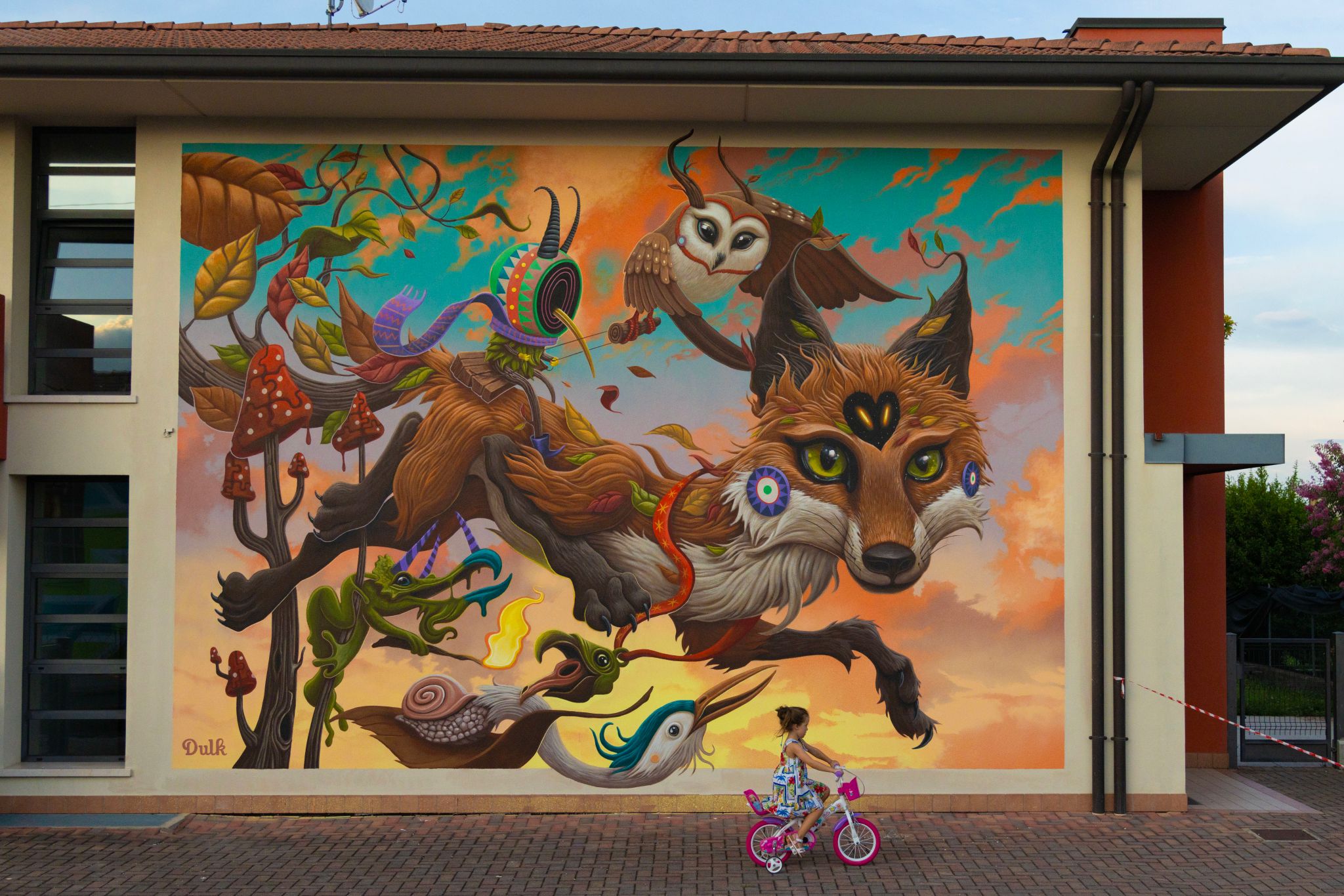 Con un registro narrativo e neo-naturalista, Dulk compone una processione di creature in transito: una volpe guida un corteo di esseri ibridi – una rana con corpo di dinosauro, un gufo pensoso, una chiocciola-airone – simboli di ecosistemi in fuga. «Sono esseri che rappresentano il tentativo stesso della natura di reinventarsi per sopravvivere», afferma l’artista: «Tutti avanzano insieme, guidati dallo spirito del viaggio». L’opera amplia la vocazione ambientale della sua ricerca, che spesso si muove tra scenari da fiaba e riferimenti a temi sociali di attualità.