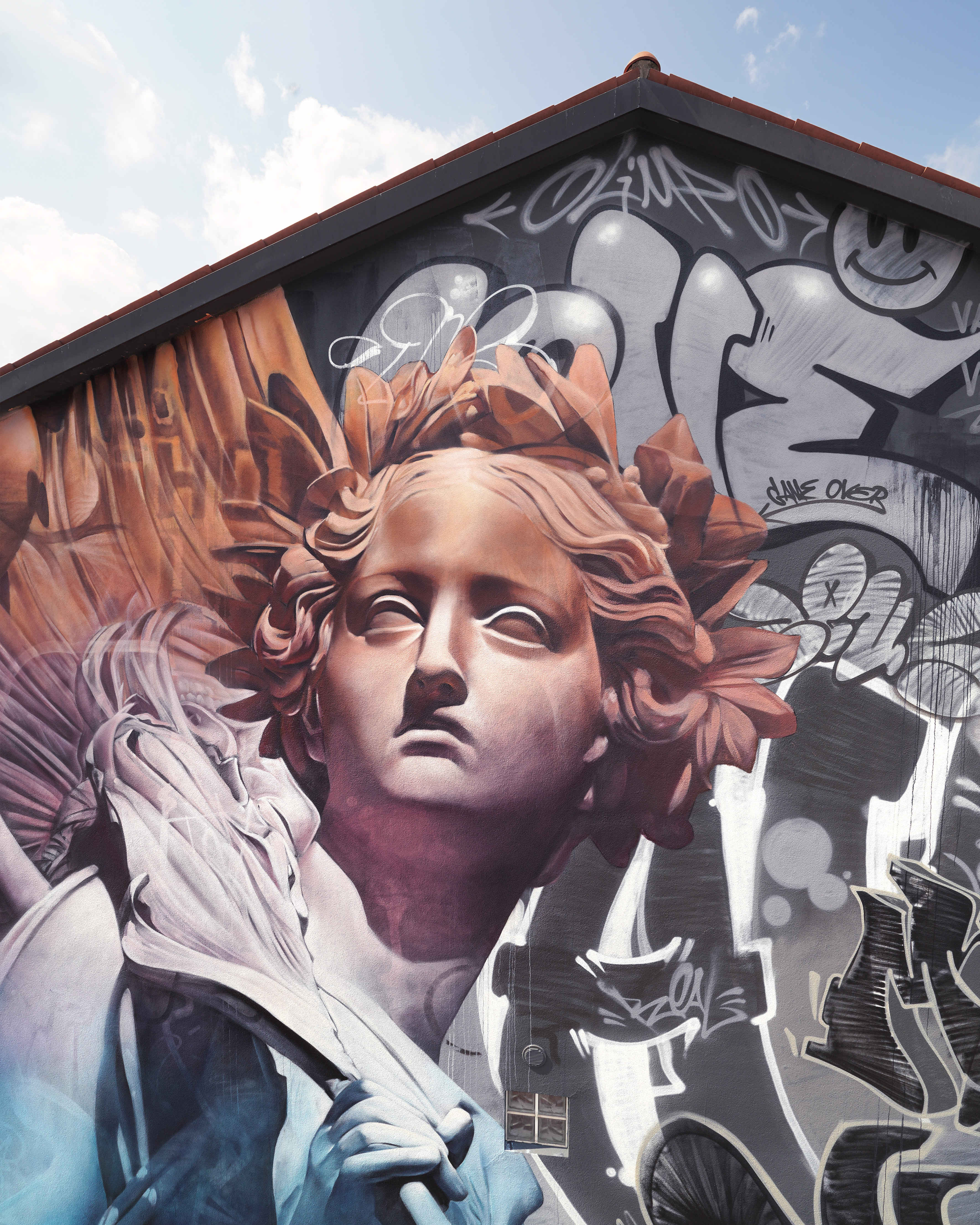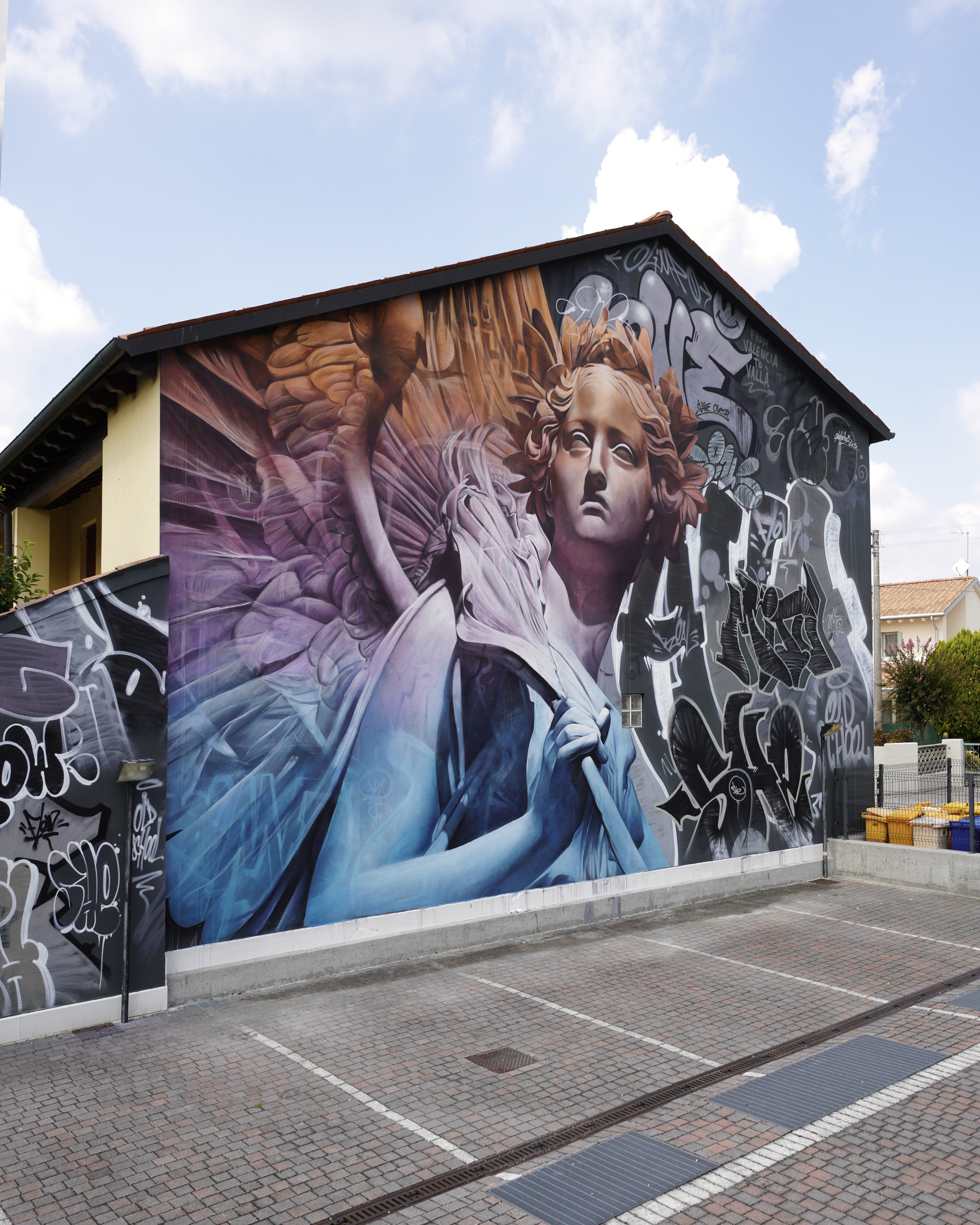 Il duo PichiAvo ha realizzato a Vallà una Nike alata che fonde scultura classica e linguaggi del writing. Su un fondale di lettering in bianco e nero, la dea emerge con una tavolozza calda, come un rilievo che prende vita tra velature e trasparenze: un manifesto della loro mitologia urbana, con l’eredità greco-romana che dialoga con l’energia della strada. Un «Inno all’indipendenza creativa», come si legge nel testo critico firmato da Antonella Alban che mette a fuoco il contrasto fecondo tra il graffito e la figura accademica, capace di attivare connessioni identitarie e senso di comunità.
