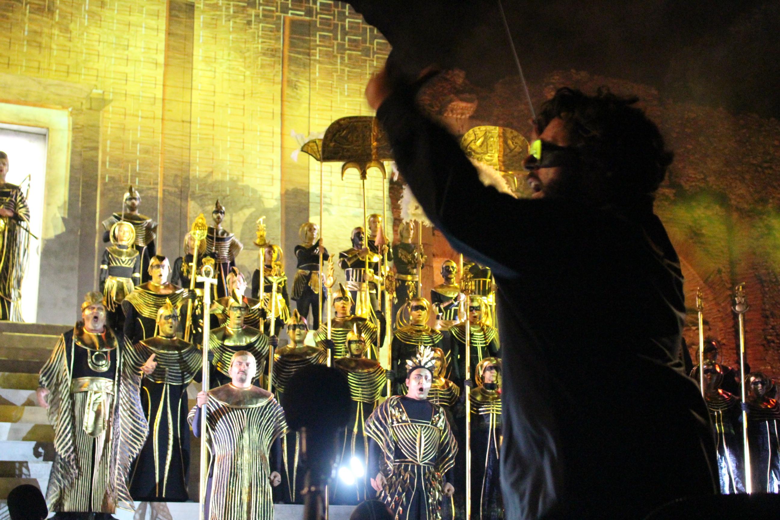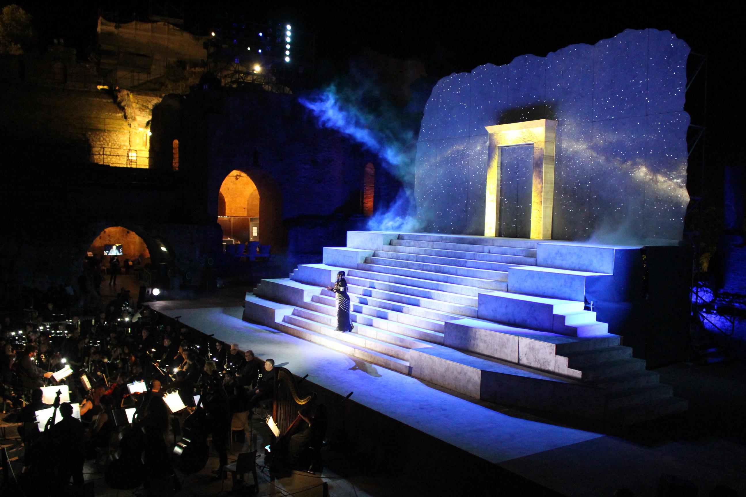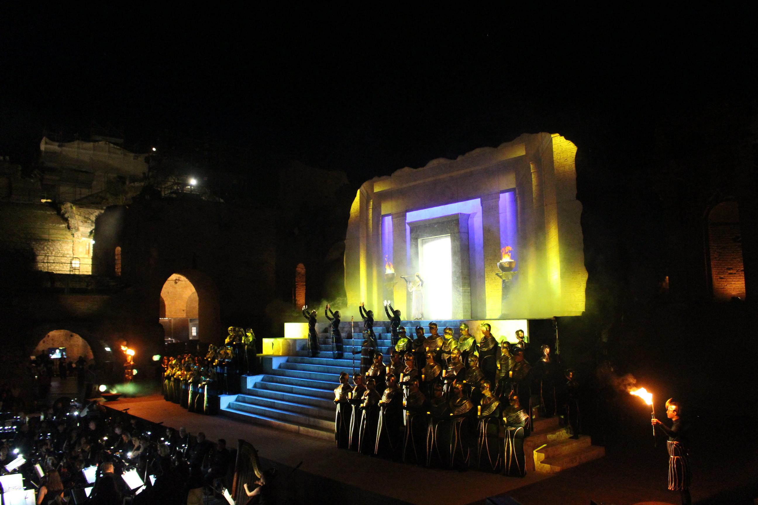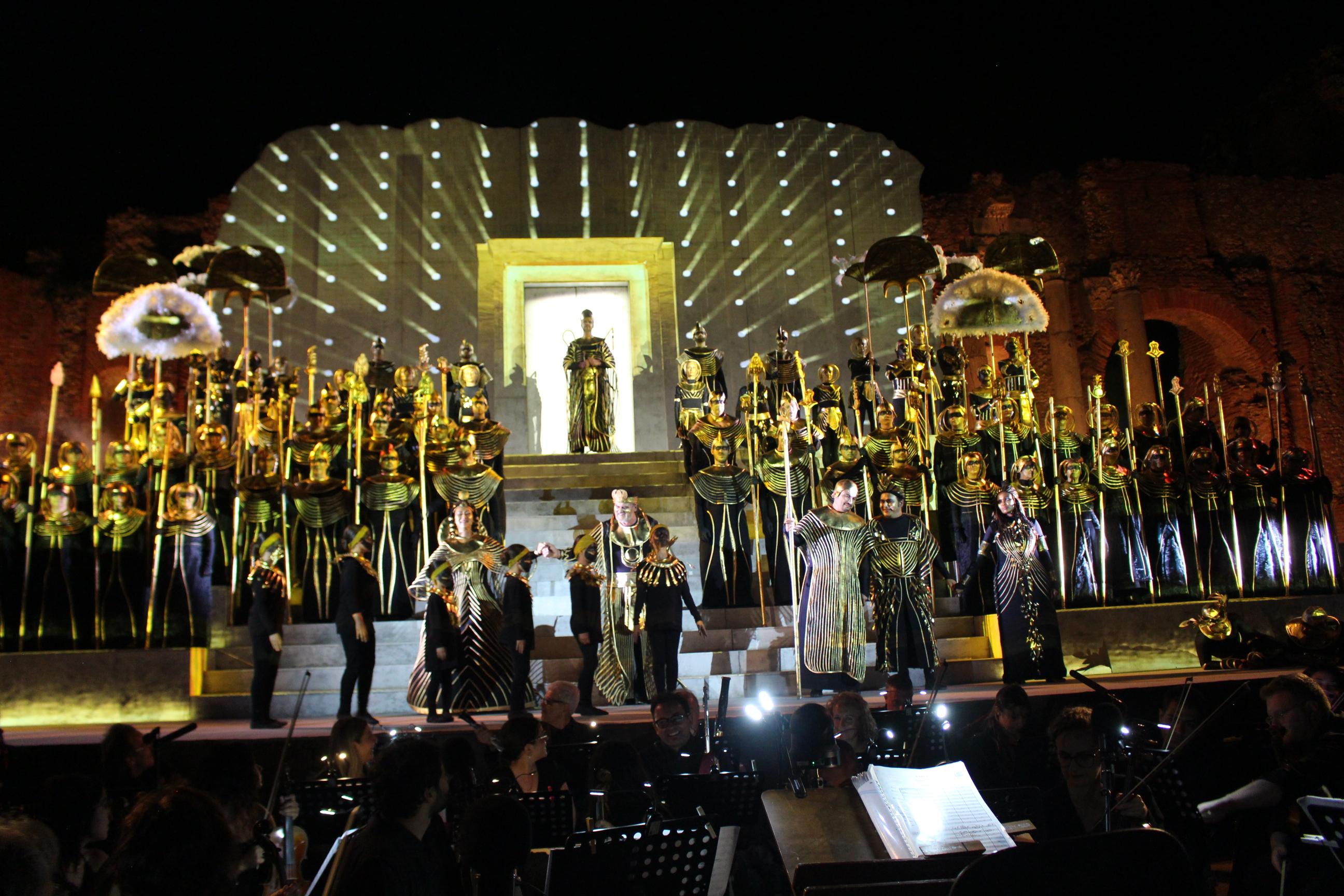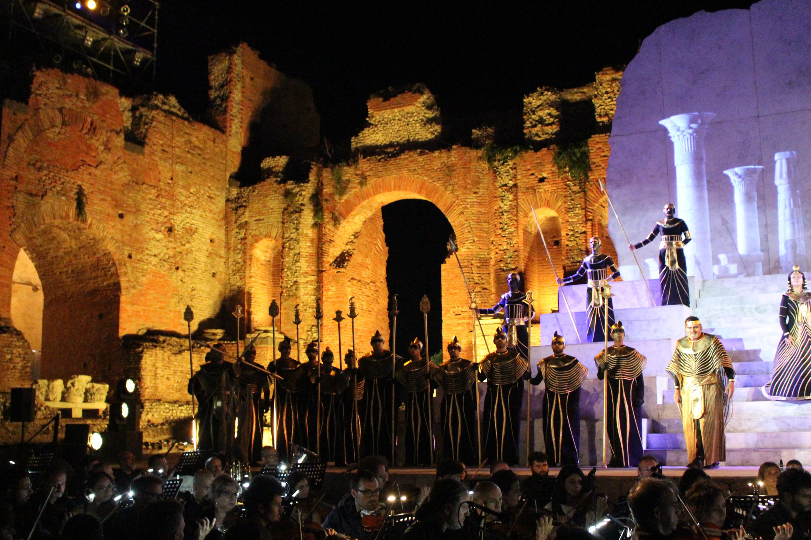 Dopo il meritato successo in altri due importanti siti archeologici – di Siracusa e Tindari -, l’opera lirica diretta dal Maestro Filippo Arlia ha avuto il suo compimento in quell’emiciclo monumentale che s’affaccia sul mare e con l’Etna sullo sfondo, dove avviene il «Trionfo della vista». Niente palme, né animali esotici, né piramidi nell’Egitto di Faraoni, re, eserciti, sacerdoti e sacerdotesse, per contestualizzare l’ambiente che accoglie la trama del melodramma verdiano.
