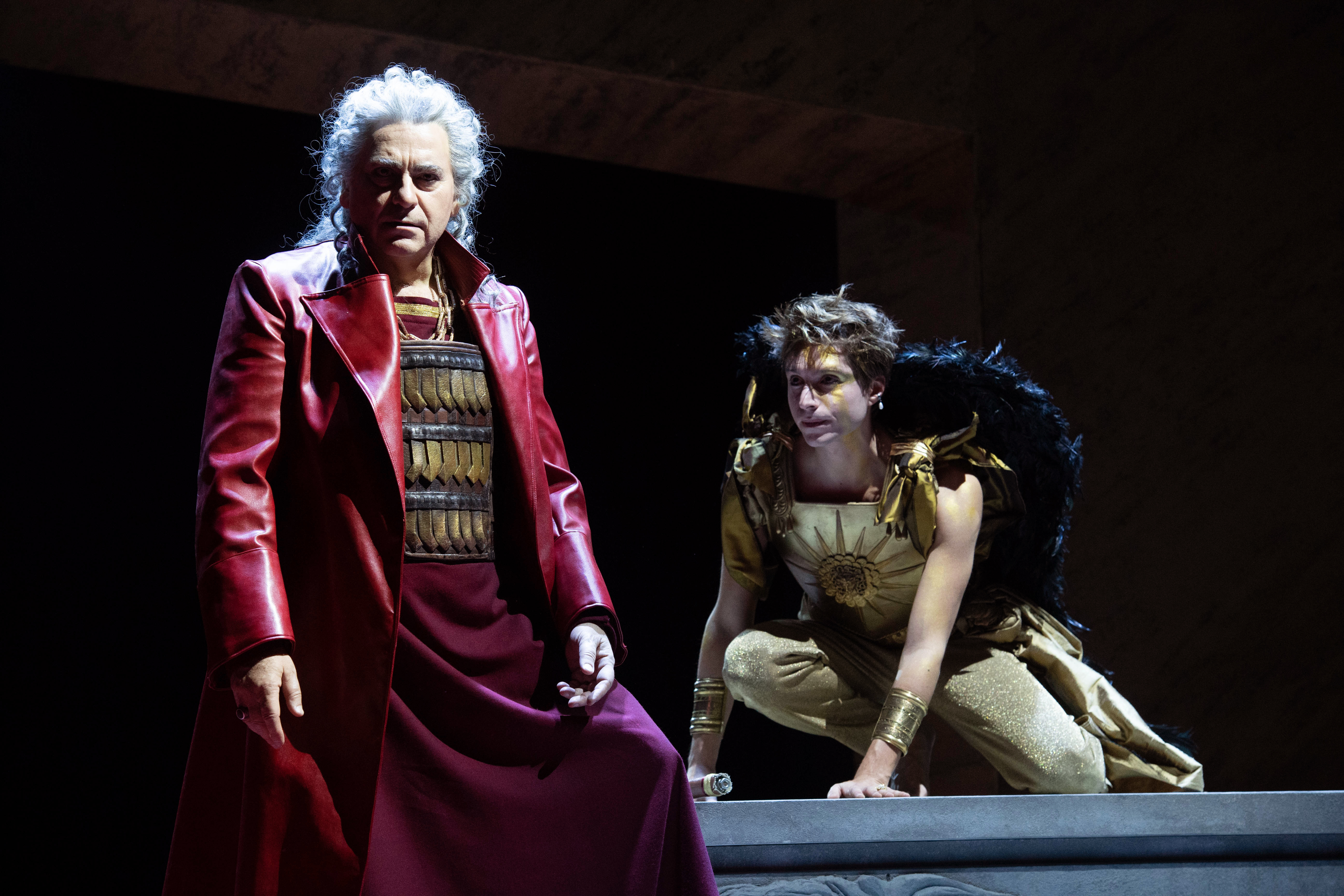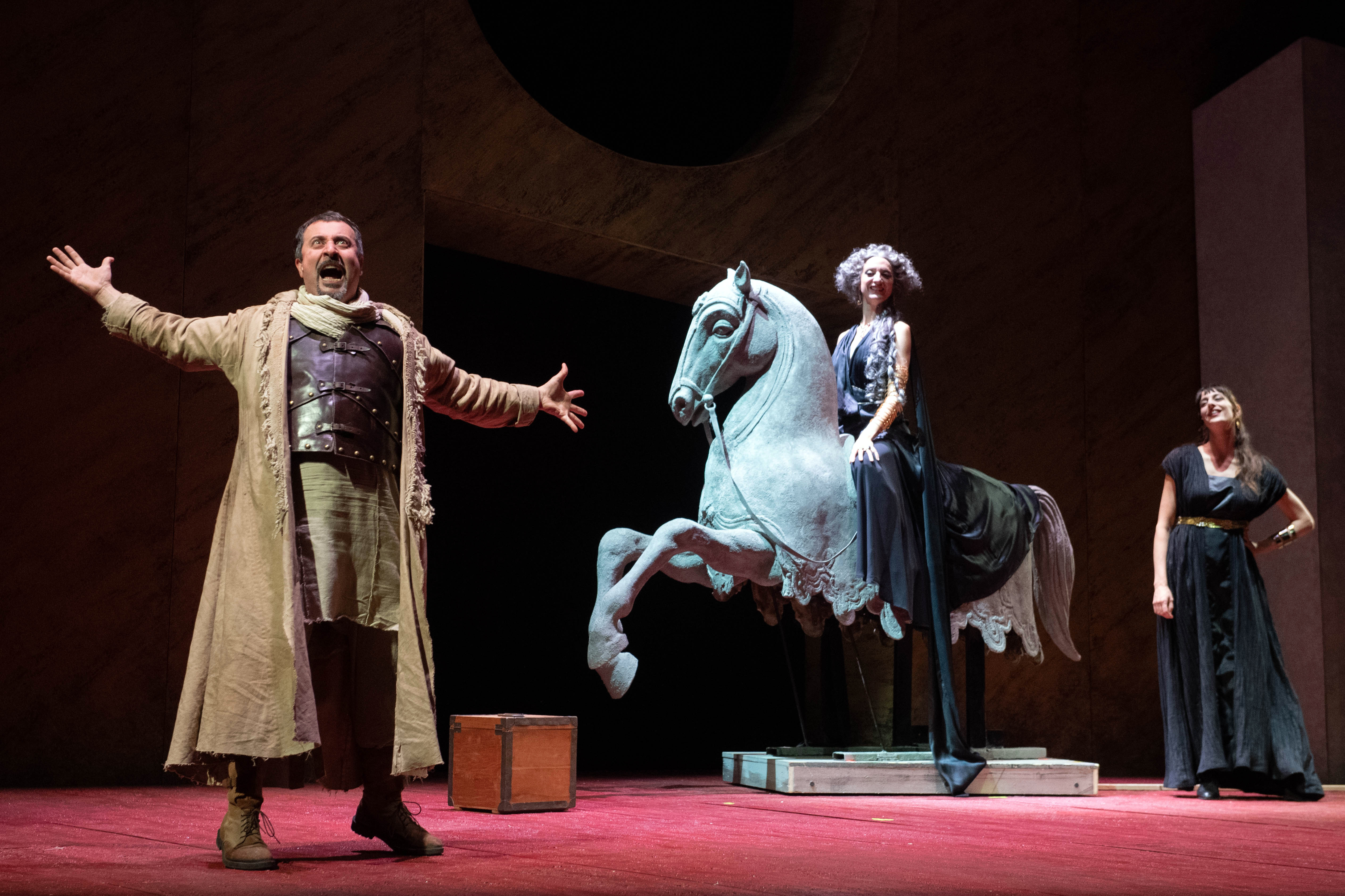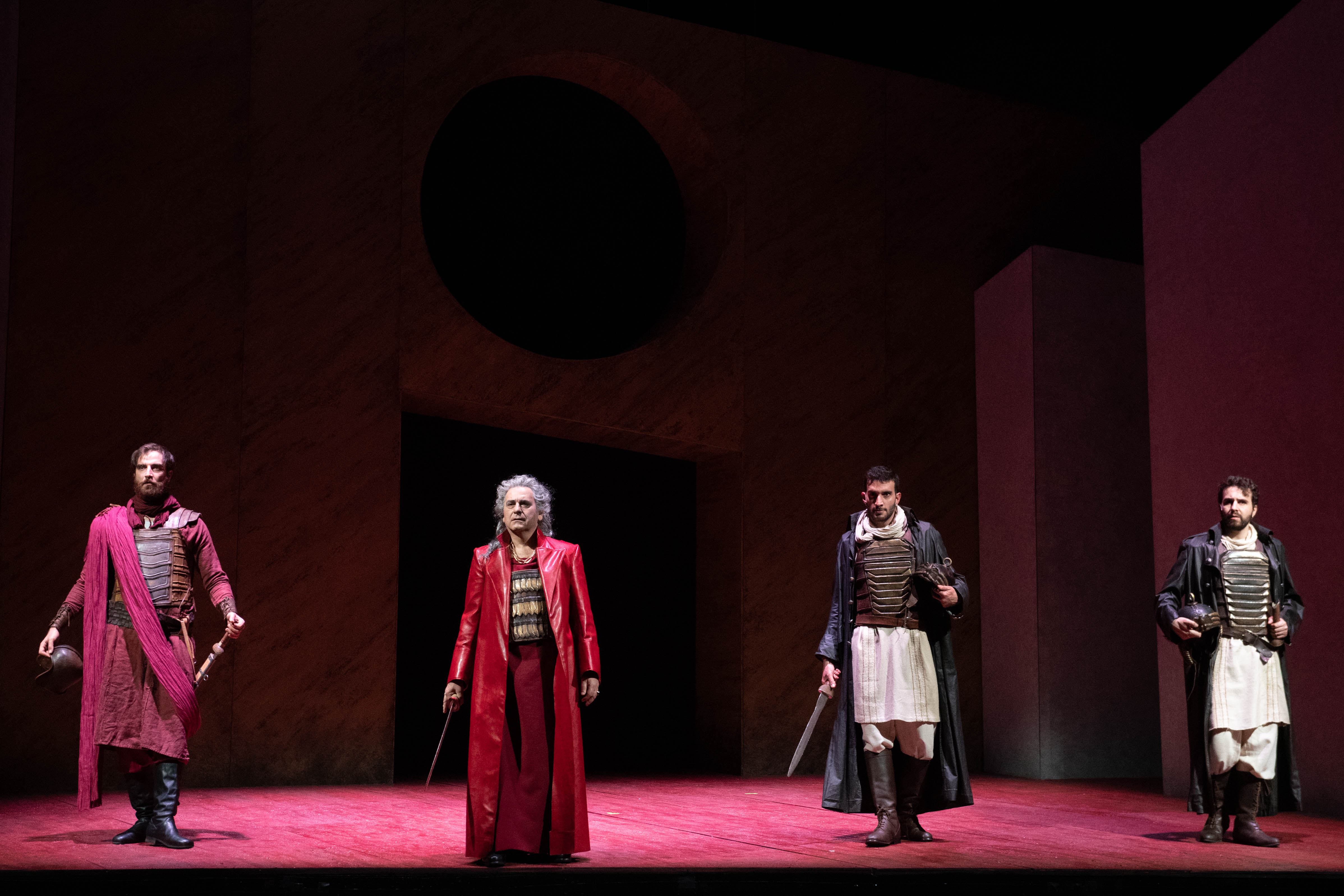 Il destino d’entrambi gli amanti appare subito direzionato verso la tragedia, come due maturi Giulietta e Romeo costretti a rincorrersi beffandosi anche nella morte, per raggiungersi appena prima che lui si spenga sul tumulo di lei. Precedentemente lo avevamo visto torreggiare solo in scena, inetto a suicidarsi come i suoi fedeli che ne rifiutavano il compito, come anche Eros che si uccide per devozione; e ancor prima era a cavalcare la battaglia e gli eventi guerreschi solo evocati dal racconto degli stessi personaggi, le cui voci e le azioni sono accompagnate per tutto lo spettacolo da una costante colonna sonora (di GUP Alcaro) in sottofondo che include un arpeggio live (arpa celtica di Dario Guidi, Eros), e dei brani rock anch’essi dal vivo.