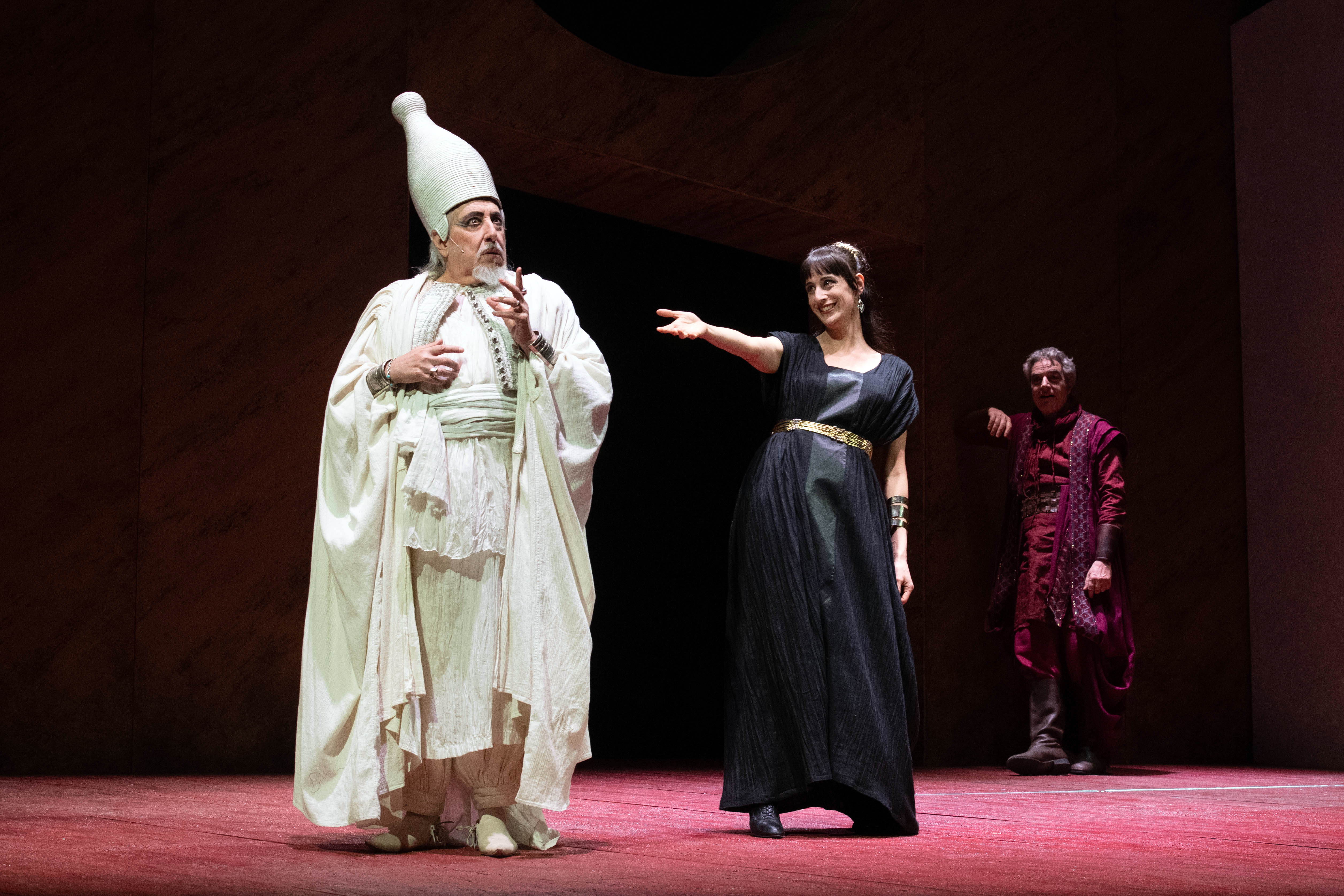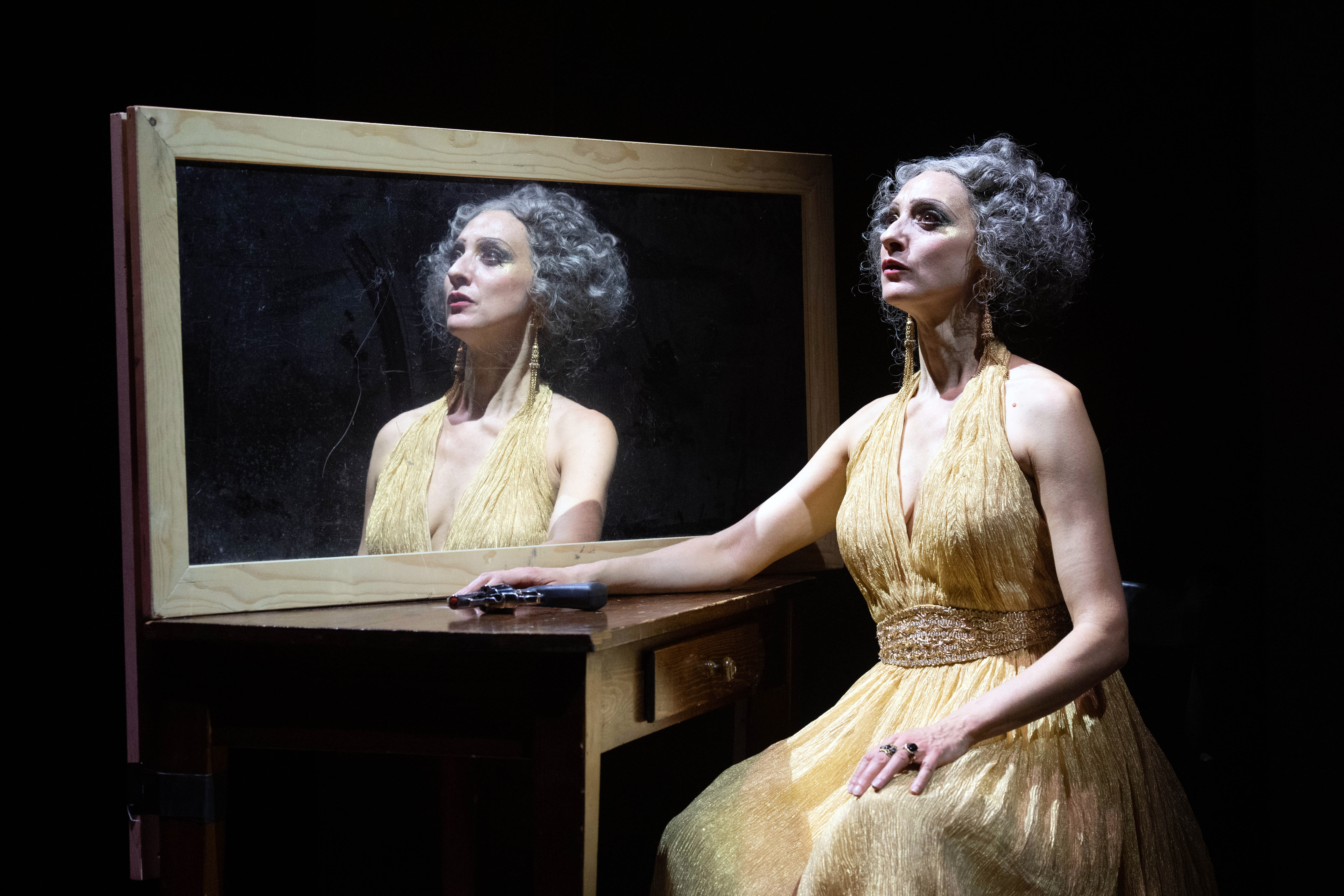 Nell’interpretazione di un’appropriata, bravissima Anna Della Rosa, Cleopatra è donna mutevole, “qual piuma al vento”, irascibile e vanitosa, brillante e severa, capricciosa quanto basta, che alterna toni e pose comiche ad altre drammatiche, d’attrice consumata anche nello sfoggio di una varietà d’abiti a seconda dell’umore. La sua fine, orgogliosa e solenne, si consuma davanti ad uno specchio da camerino, non più col morso di un aspide ma con una pistola. La voluta teatralità esagerata, esibita, è nei toni soprattutto dei due protagonisti, che, prima di virare verso una più convenzionale recita, all’inizio interpretano come dei personaggi da sit-com con tanto di applausi e risate fuori campo (uno scarto di registro che poteva rappresentare una più netta e originale chiave registica). Al servizio della parola c’è comunque la magnifica squadra attoriale composta, oltre dai due protagonisti principali, da Danilo Nigrelli, Massimo Verdastro, Dario Battaglia, Paolo Giangrasso, Noemi Grasso, Ivan Graziano, Dario Guidi, Flavio Pieralice, Gabriele Rametta, Carla Vukmirovic.