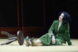 Un ring, un campo di battaglia, un luogo di reclusione. Quella grande stanza dai lunghi tendaggi verde scuro con, allineati in proscenio, dei piccoli gatti di porcellana rivolti verso il pubblico, è tutto questo. E altro ancora. Quel luogo che, a tratti, rimanda a certe atmosfere del cinema di David Lynch, nell’allestimento del regista Antonio Latella, è spazio della mente, è palcoscenico della vita reale e irreale, perimetro dell’immaginazione, di fuga dal mondo e rifugio. Fra quelle mura domestiche, i quattro personaggi del dramma Chi ha paura di Virginia Woolf? dell’americano Edward Albee, spostandosi continuamente tra una poltrona, un armadio a doppia anta che è anche porta, un pianoforte verticale messo di sbieco, e un mobile quale punto di attrazione per bevute di alcol qui solo immaginato nei bicchieri e nelle bottiglie vuote, consumano un gioco al massacro tutto verbale, un crudele duello fatto di complicità, grida, livori, isterismi. In questa ragnatela di squallore, amore, sarcasmo, sono finiti George, mediocre professore universitario di biologia, e la moglie alcolizzata Martha, figlia del preside di un piccolo college. Sono una coppia di mezza età il cui rapporto è arrivato al capolinea. Si detestano, eppure continuano a stare l’uno al fianco dell’altra, tra menzogne e complicità.
