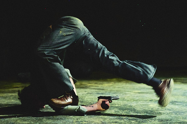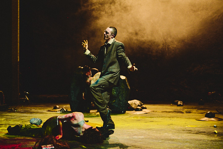 Questo dei Peeping Tom è teatro dal segno cinematografico, scandito dalla straordinaria danza – poca in verità – dei cinque interpreti: corpi gommosi, ginnici, deformabili, dai movimenti atletici, vorticosi, imprevedibili (sono Simon Bus, Seungwoo Park, Charlie Skuy, Boston Gallacher e Balder Hansen). Si scontrano con gli oggetti, saltano e rimbalzano a terra, traballano piegandosi all’indietro, rivelando tensione e fragilità, forza e morbidezza. C’è l’assolo di un uomo scheletrico sanguinante, di un altro costretto a bere una pozione chimica, di un trio di sagome nere in posture da nani intenti a combattere, mentre poco prima altri avevano spruzzato della polvere bianca nell’aria, alterando il paesaggio.