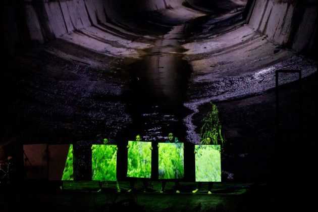 Dietro il palco un maxi-schermo, campo per la policromia accattivante della Mappa dei corpi idrici di Genova di Juan Lopez Cano; come per i secchi contributi video di una città schiacciata tra natura selvaggia e lavori in corso (con tanto di “immersione” nello scolmatore del Fereggiano), opera di Positano. Davanti i rifiuti del rio Molinassi, plasmati da Servi in quattro sistemi scultorei a bordo palco. In mezzo Genova tutta. Una città che ritrova la consapevolezza del suo essere terreno di una convivenza silenziosa tra due tipi di popolazione: quella umana, che si muove a piano strada, e quella idrica, “addomesticata” dall’uomo stesso nel corso dei decenni e sempre pronta a risalire dal basso a richiedere il proprio spazio. Ascoltarsi tra “corpi”, trovare un punto d’incontro pacifico tra le parti, è la priorità di oggi in vista di un domani.