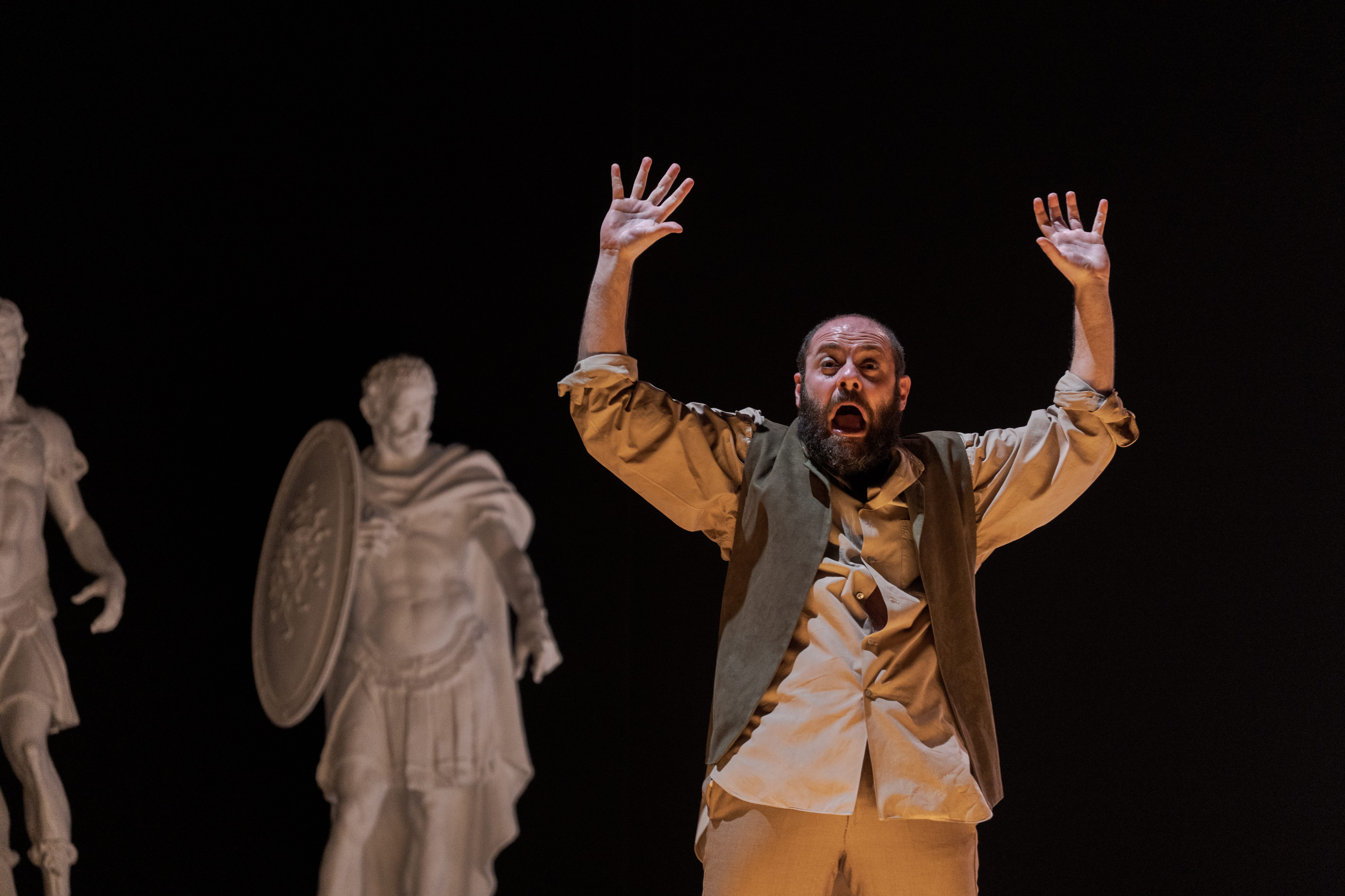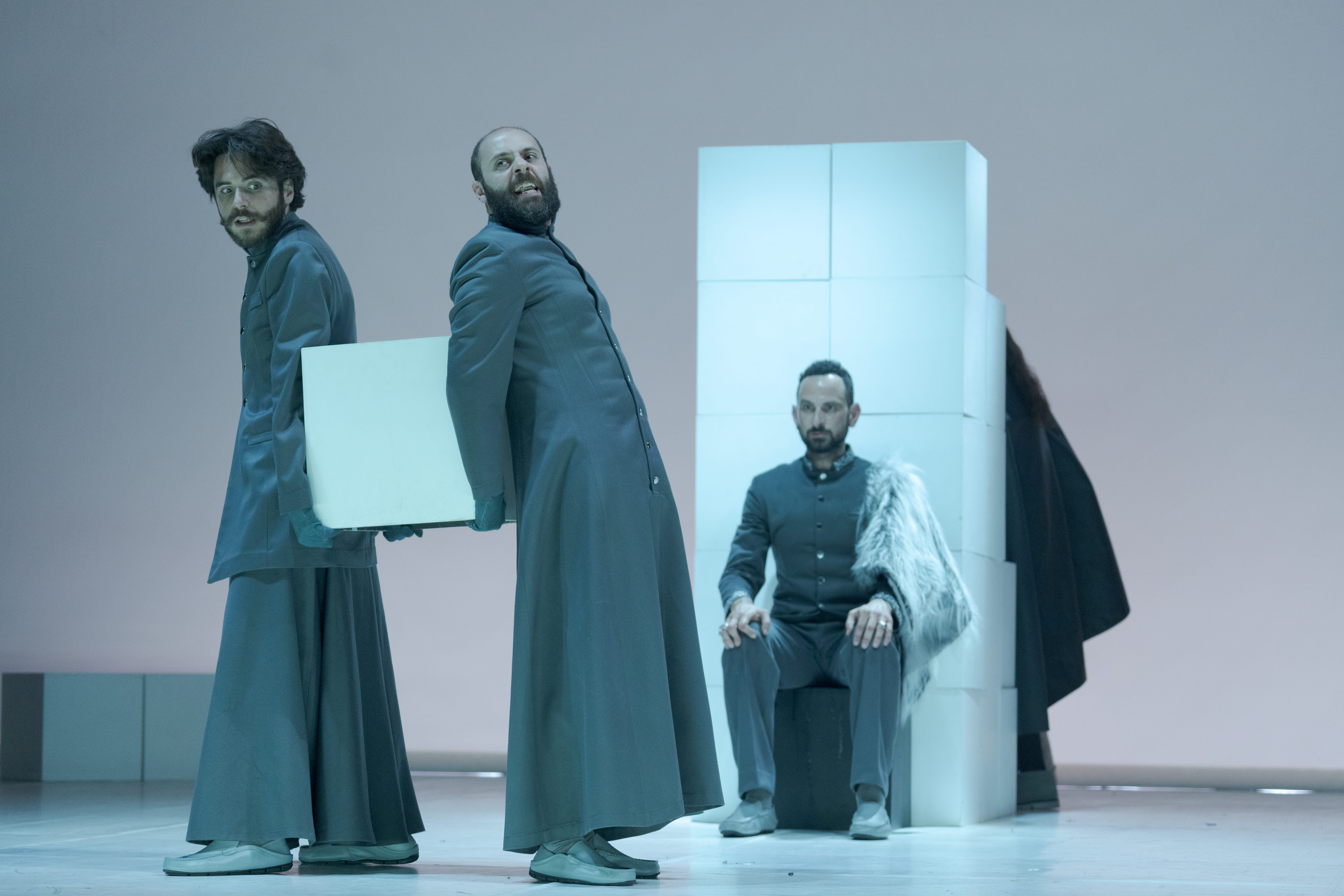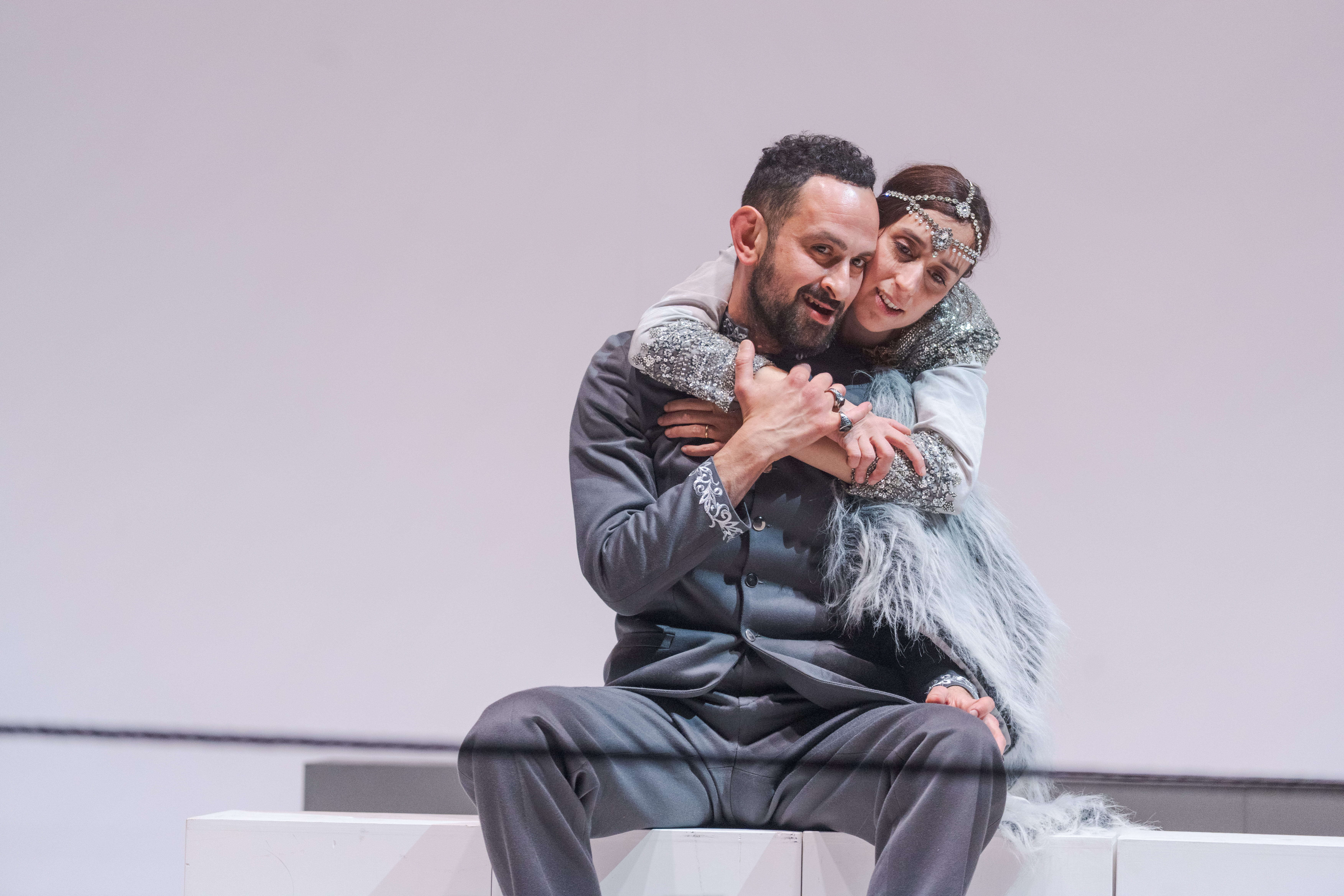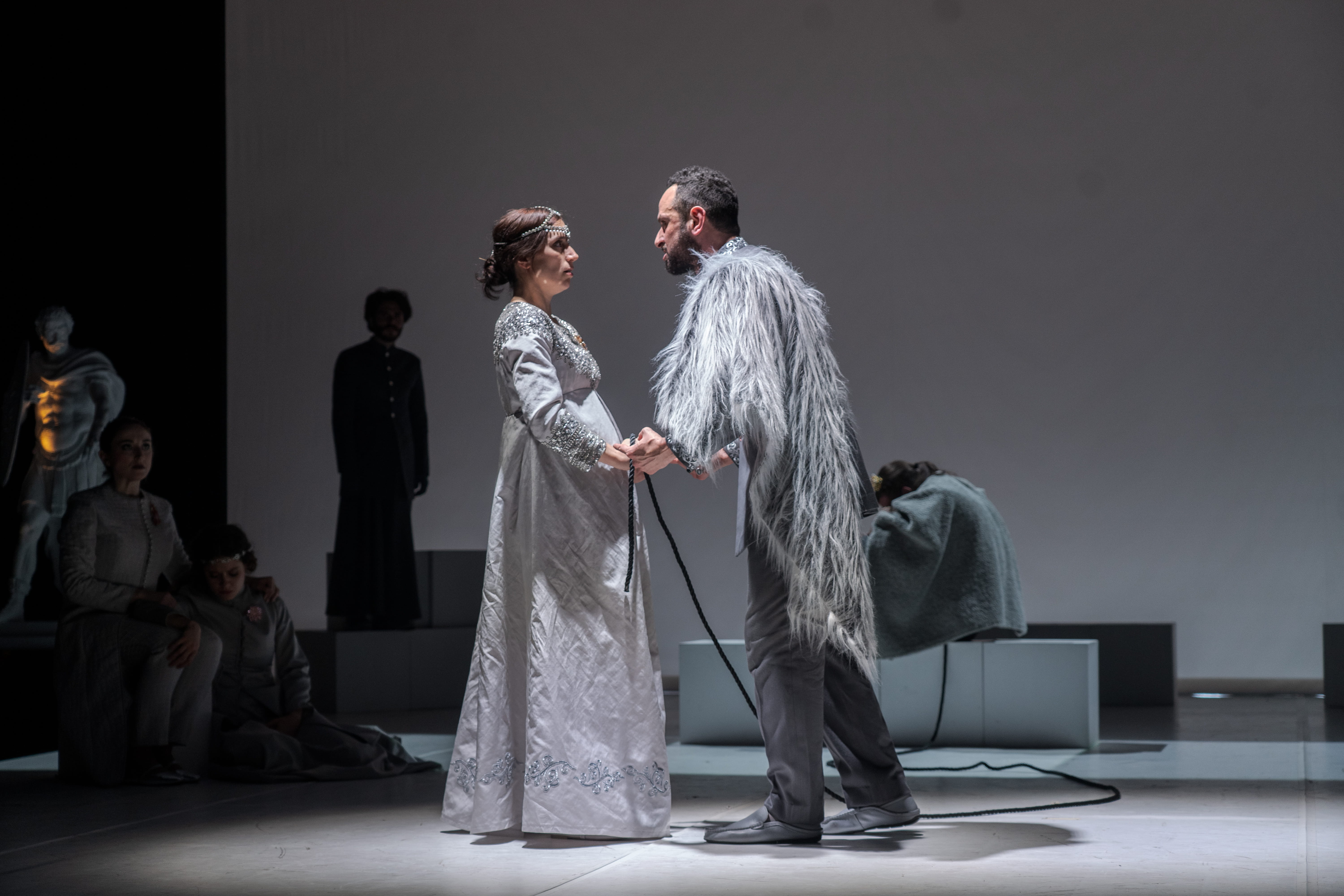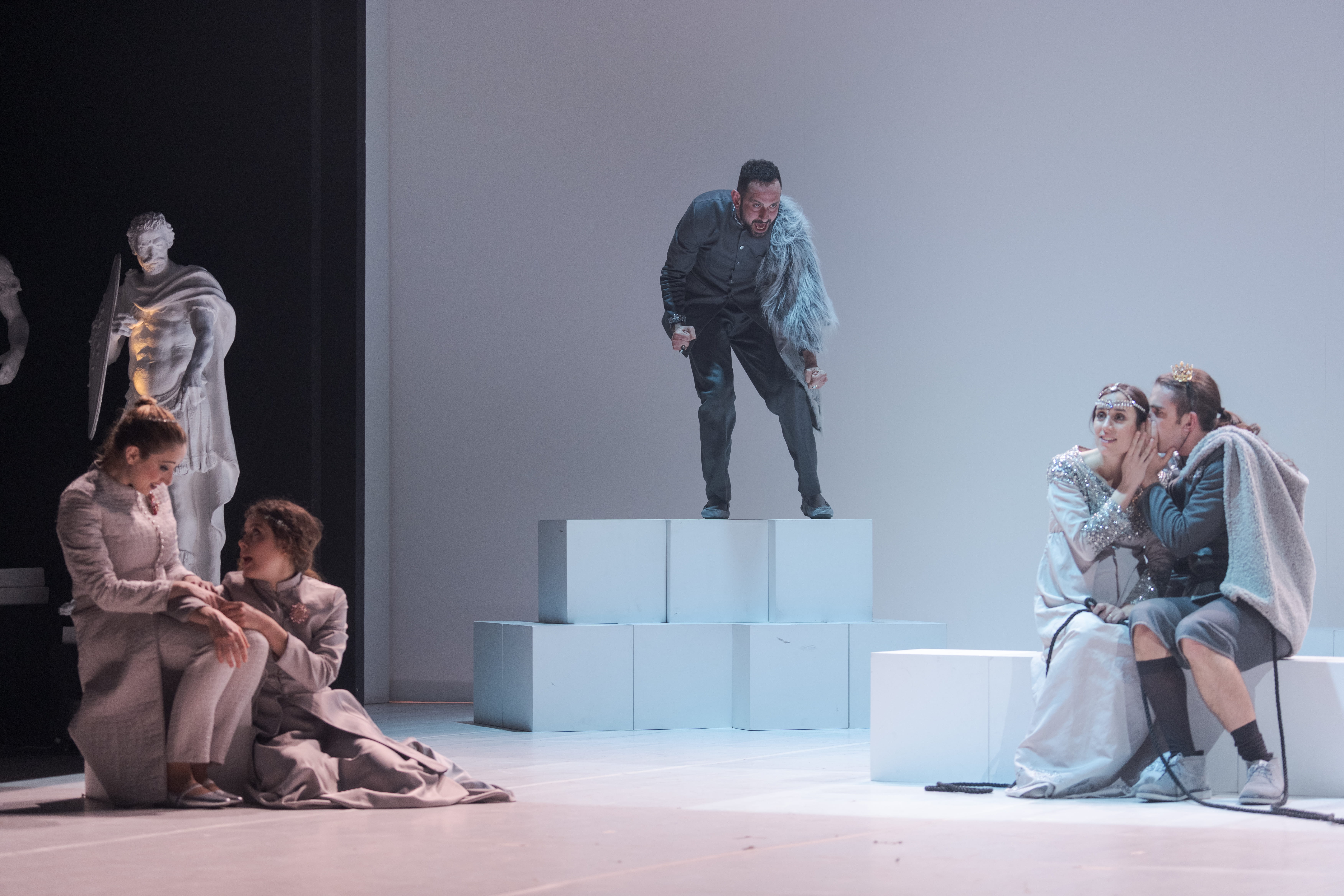 Collaboratore per oltre dieci anni con Peter Brook e profondo conoscitore del teatro anglosassone, il regista, attore e autore McNeill firma questo allestimento con una limpidezza esemplare, al servizio del testo. Dentro una scena di indefinita fattura neoclassica – costituita da semplici cubi che, scomposti, dislocati, sovrapposti, modellano ambienti e situazioni, con ai lati delle bianche statue velate, poi magici tappeti orientali per farne una tempesta marina -, segue una più esplosiva e colorata ambientazione dove irrompono un orso bianco in elegante abito scuro che canta New York, New York (mentre insegue con un randello uno dei personaggi per divorarlo); un menestrello con chitarra – il cortigiano-furfante Autolico – insieme a un nugolo di personaggi bucolici e comici che irrompono dalla platea in proscenio, dando vita alla seconda parte della storia davanti al rosso sipario chiuso. Ed è il paesaggio sonoro creato dalle musiche, dal minimalismo monocromatico, eseguite dal vivo da Claudio Scarabottini, ad accompagnare il viaggio emotivo del racconto al quale danno consistenza visiva le luci di Stefano Bardelli e i costumi di Elisabetta Zinelli.