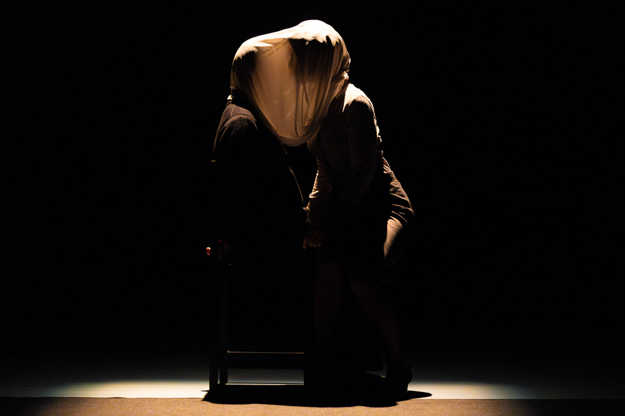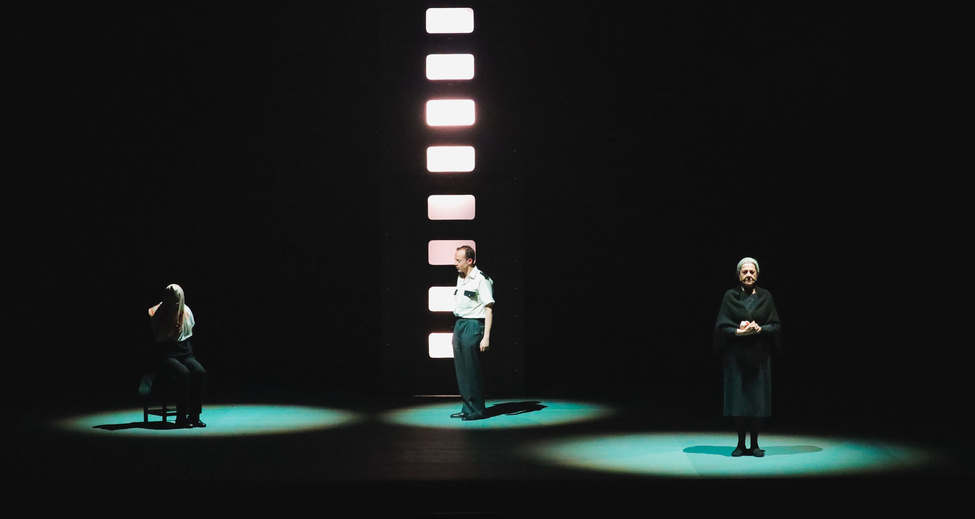 Elemento scenografico è una sorta di totem che troneggia al centro: un calapranzi, un montacarichi, simile ad un lungo ascensore, a indicare che siamo in uno scantinato, un bunker, un sotterraneo, luogo dove si tessono trame oscure da nascondere alla luce. Qui, con Il bicchiere della staffa ispirato dalle pratiche della dittatura argentina, s’inscena l’interrogatorio cui Nicolas, un funzionario governativo, sottopone in sequenza il sovversivo Victor (riferimento al poeta e regista cileno Victor Jara, torturato e ucciso ai tempi di Pinochet), la moglie Gila e il loro figlio Nicky (questi compaiono solo in un video proiettato in alto), incarcerati, e sottoposti evidentemente a torture e violenze. Il dramma è tagliente come una rasoiata nella sua lucidità e capacità di esprimere la sostanza del male, essendo tutto giocato sullo iato che si crea tra il linguaggio formalmente corretto e amichevole di Nicolas e ciò che sottintende.