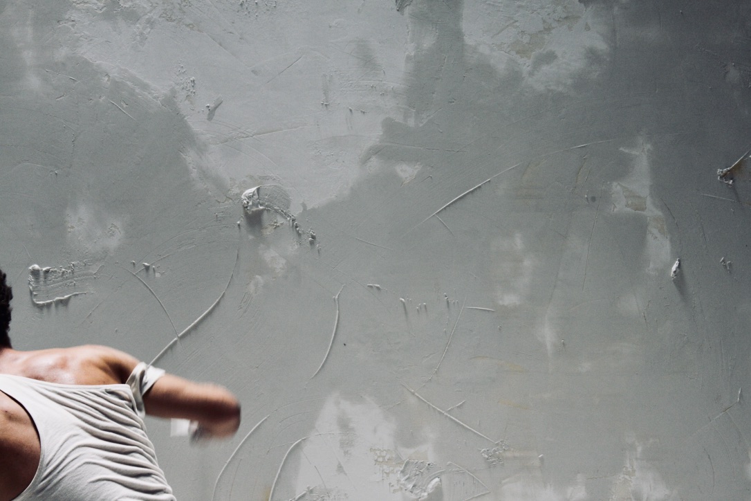 Di scatto si gira verso il pubblico: «Non è semplice parlare di cose semplici! Mi devo preparare le risposte, me le devo scrivere: risposte diverse, per persone diverse», dice quasi timidamente. Da qui in avanti, continuando a lavorare e soffermandosi, inizia il suo soliloquio di pensieri ad alta voce. Sono libere riflessioni, gridate, sussurrate tra se e se, desideri e domande senza risposte. «Vorrei solo che mi venisse a trovare qualcuno mentre lavoro, un amico che viene, si siede, mi guarda. Oppure tutti! Tutti i miei amici, i parenti, i conoscenti, i futuri conoscenti i clienti! Tutti a vedere quello che faccio, così che quando li incontro non me lo devono più chiedere», esclama tra una pausa e l’altra spinto dal dover dare spiegazioni, mentire o asserire la verità sulla sua vita. S’incanta davanti a quella parete biancastra quasi fosse un quadro d’artista, un oggetto con un’anima: «Perché se non la guardi a tutte le ore del giorno – esclama con convinzione –, la parete non la capisci, se non la fissi mentre si asciuga, non sai dove manca materia, se non la sporchi non ti puoi prendere cura di lei, di ripulirla, ci devi dormire accanto e cambiare posto ogni volta e capire dove sprigiona più umidità, dove è più calda, dove è più fredda, dove di accoglie, dove ti calma e dove ti agita. Perché non sei solo tu a fare lei».