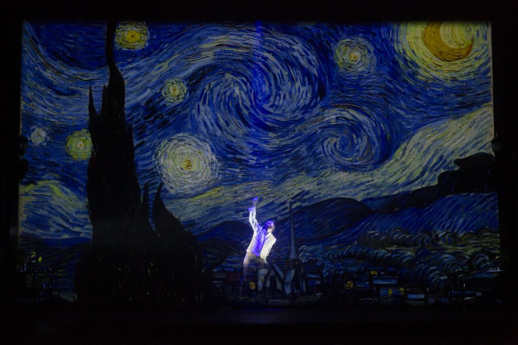 Lo spettacolo si distingue per la sua natura multisensoriale: un’orchestra dal vivo accompagna le scene con melodie che richiamano la tradizione musicale francese, evocando artisti come Edith Piaf, Mireille Mathieu, Yves Montand e Charles Aznavour. Le coreografie spaziano dal flamenco alla danza contemporanea, amplificando le emozioni e rispecchiando la complessità interiore di Van Gogh. Le animazioni 3D proiettano lo spettatore direttamente dentro i celebri dipinti come Notte stellata, Campo di grano con volo di corvi e i celebri Girasoli.
