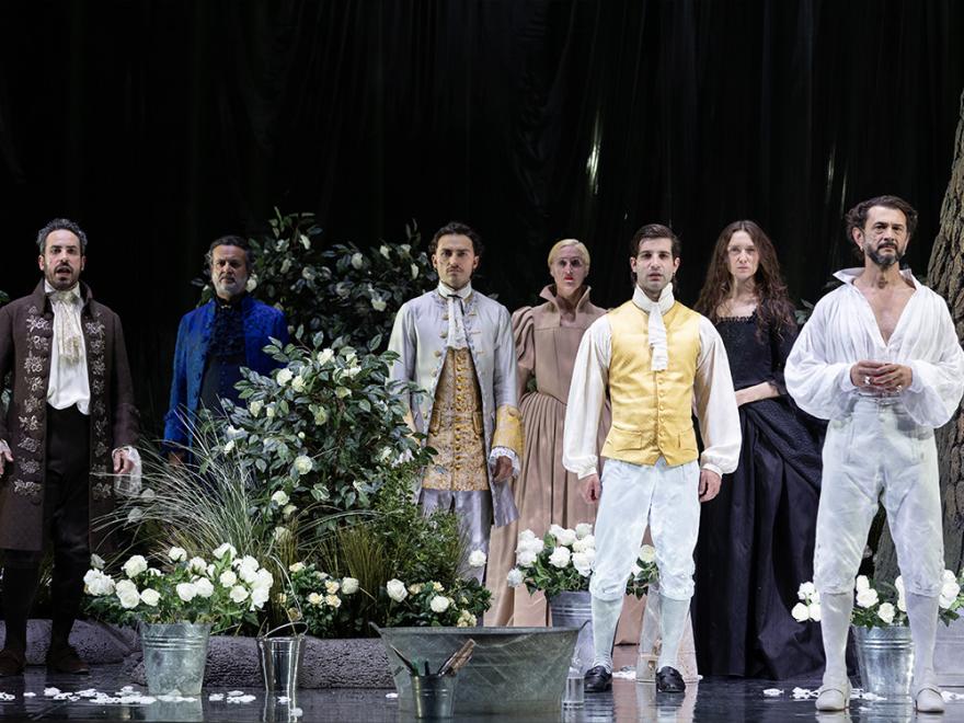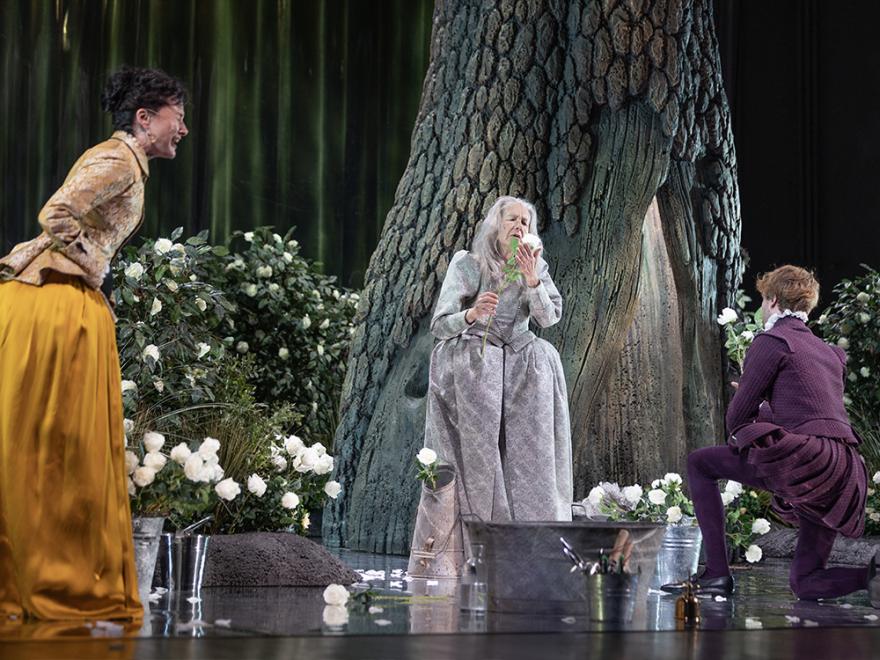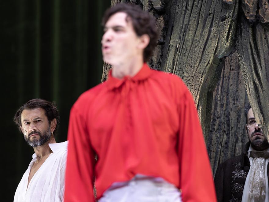 La scena, che dovrebbe evocare un Eden primigenio, ricorda piuttosto un giardino inglese attentamente pettinato: rose bianche ovunque, come segni di una purezza che sembra più dichiarata che interrogata. Al centro, un grande tronco d’albero funge da totem polifunzionale: rifugio, nascondiglio, quinta, torre. È un elemento scenico di forte presenza, capace in teoria di catalizzare la vicenda ma che rimane più allusione che azione, più simbolo che dinamica. La sua neutralità finisce per sommarsi alla compostezza dell’ambiente circostante, generando un paesaggio che osserva, più che partecipare.