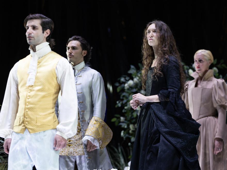 Dentro questo quadro raffinato si muove un cast composto, tra gli altri, da Vinicio Marchioni, Giulia Mazzarino, Candida Nieri e Luca Ingravalle. Splendidamente vestiti in questo contesto così sorvegliato, la recitazione procede come trattenuta da una sorta di ritmo uniforme, sempre in prossimità dell’enfasi ma senza veri affondi. Le voci si muovono su un registro che tende alla solennità continua, come se la tragedia esigesse un volume costante piuttosto che un lavorio sulle sfumature. Non è questione di assenza ma di un’energia che rimane spesso in superficie, come se il testo non trovasse una frizione interna capace di incrinare quell’estetica così precisa.
