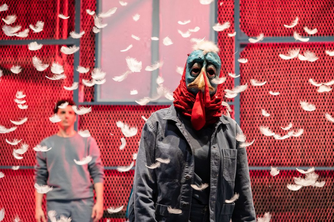 Il testo del 2021 di Emanuele Aldrovandi, abile e riconosciuto drammaturgo di teatro e cinema, è una sorta di esorcismo – catartico e liberatorio – che ci aiuta a metabolizzare il nostro presente con ironia, lucidità e un pizzico di grottesco surrealismo, utilizzando un linguaggio tragicomico, con dialoghi affilati e serrati. In un mondo incastrato dentro ritmi frenetici e disumani, che sottraggono tempo al pensiero e all’introspezione, riducendo il dialogo tra gli individui a litigi “da bar” o “da social network”, l’arrivo di un virus che trasforma le persone in tacchini blocca e distorce ogni cosa. Così, le due coppie protagoniste della storia, persone comuni, portatrici ognuna di una diversa posizione filosofica della vita, si ritrovano nell’androne di un palazzo assalite da domande, frustrazioni e paure.