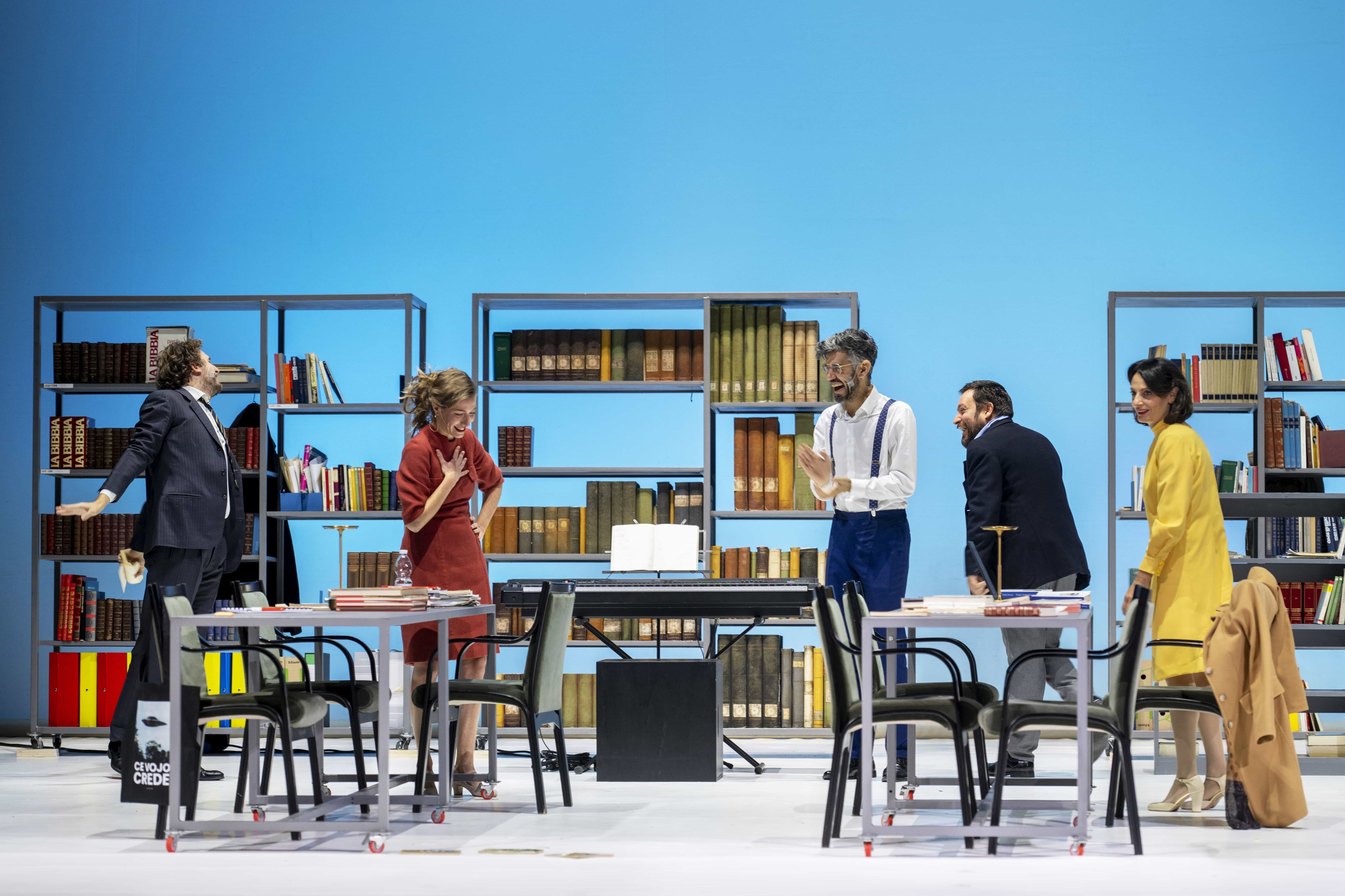 “Tipi umani seduti al chiuso. Partitura sentimentale per biblioteche”, testo e regia Lucia Calamaro, con Riccardo Goretti, Lorenzo Maragoni, Cristiano Moioli, Cristiano Parolin, Filippo Quezel, Susanna Re, Simona Senzacqua, scene Alberto Nonnato, costumi Lauretta Salvagnin, luci Nicolò Pozzerle, musiche Susanna Re. Produzione TSV – Teatro Nazionale. A Milano, Teatro Franco Parenti, fino al 18 maggio.