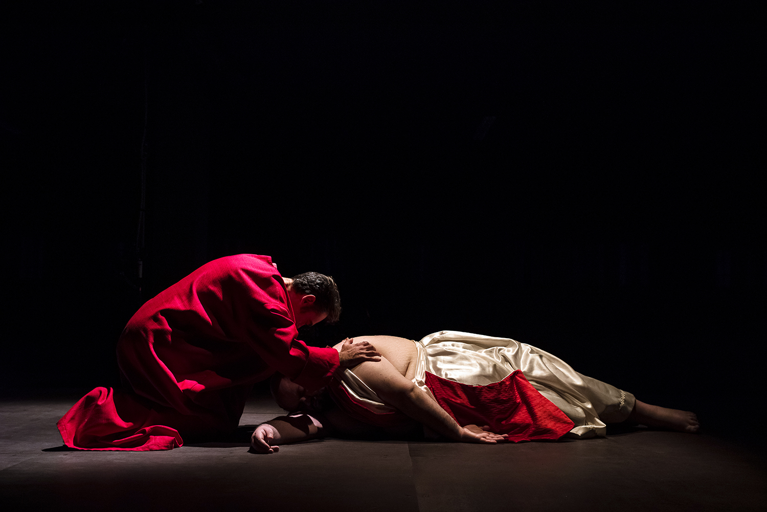 L’allestimento prende avvio da delle riflessioni – condivise con i detenuti partecipanti al laboratorio condotto dalla compagnia modenese – sull’Uomo e sulla natura umana, sul Tradimento e sulla brama di Potere, ma anche sul desiderio di Vendetta. Il testo di Shakespeare è stato oggetto di un adattamento mirato a evidenziare i nuclei tematici fondamentali, arricchiti dalla musica di Irida Gjergij, che con la sua viola accompagna uno spettacolo costruito per sottrazione. Protagonisti assoluti sono i corpi e le voci degli interpreti che fanno risuonare chiara e potente la parola shakespeariana.