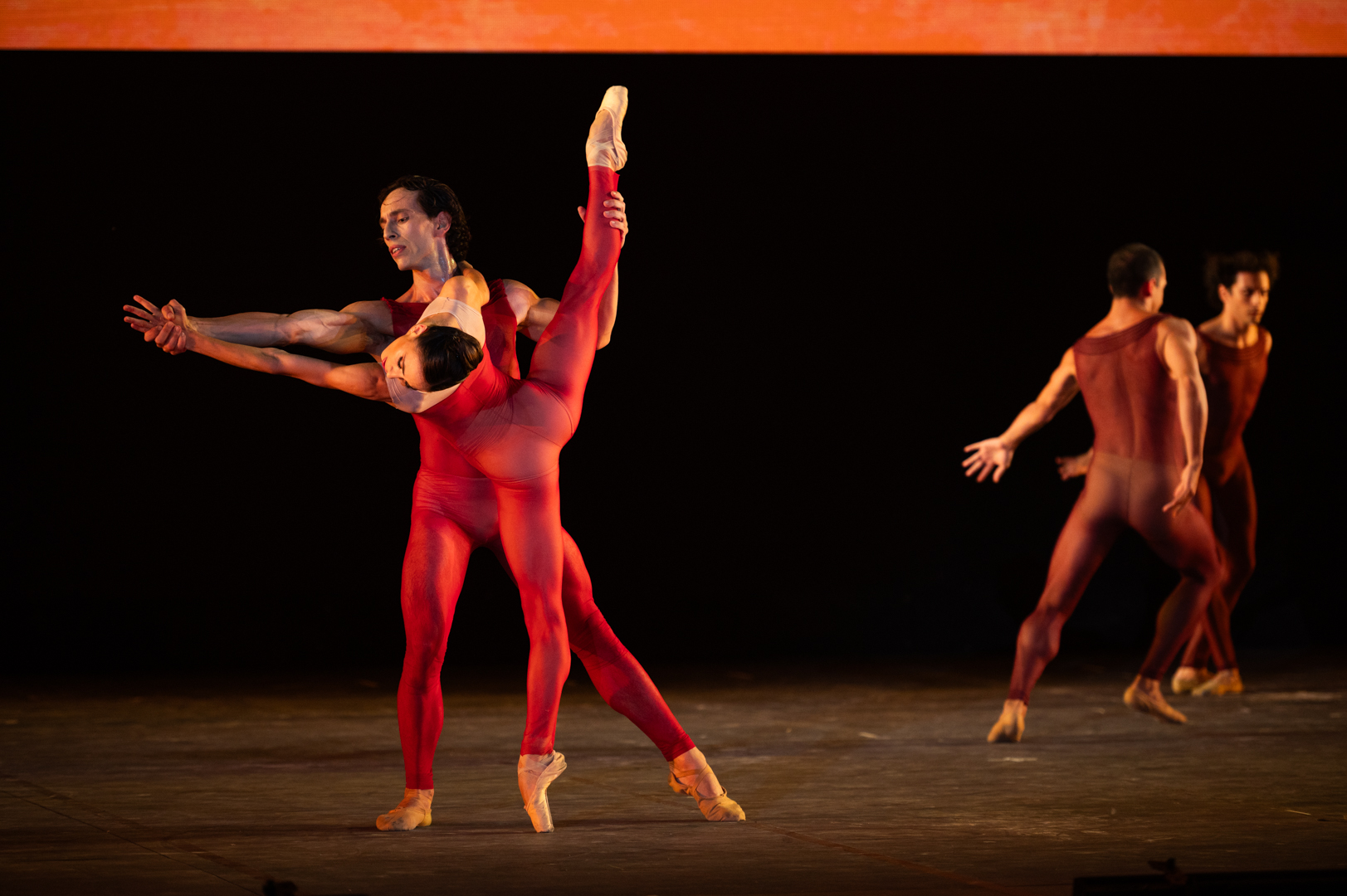 Bolero di Krzysztof Pastor, creato nel 2012 sul capolavoro di Ravel. Pastor sceglie di usare un ampio spazio rettangolare e di affidare l’esecuzione del suo Bolero a un uomo e a una donna, una coppia principale, con un corpo di ballo che li ingloba e li rilascia (scene e costumi di Tatyana van Walsum, luci di Bert Dalhuysen).