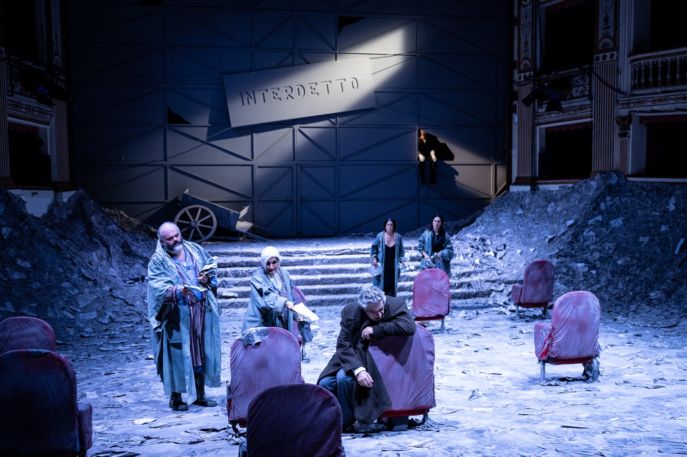 “Ezra in gabbia o il caso Ezra Pound”, scritto e diretto da Leonardo Petrillo, liberamente tratto dagli scritti e dalle dichiarazioni di Ezra Pound, con Mariano Rigillo, Anna Teresa Rossini, scene Gianluca Amodio, costumi Lia Francesca Morandini, disegno luci Enrico Berardi, musiche Carlo Covelli. Produzione TSV – Teatro Nazionale, OTI – Officine del Teatro Italiano nell’ambito del progetto “VenEzra” della Regione Veneto. A Firenze, Teatro Della Pergola, dal 24 al 29 ottobre