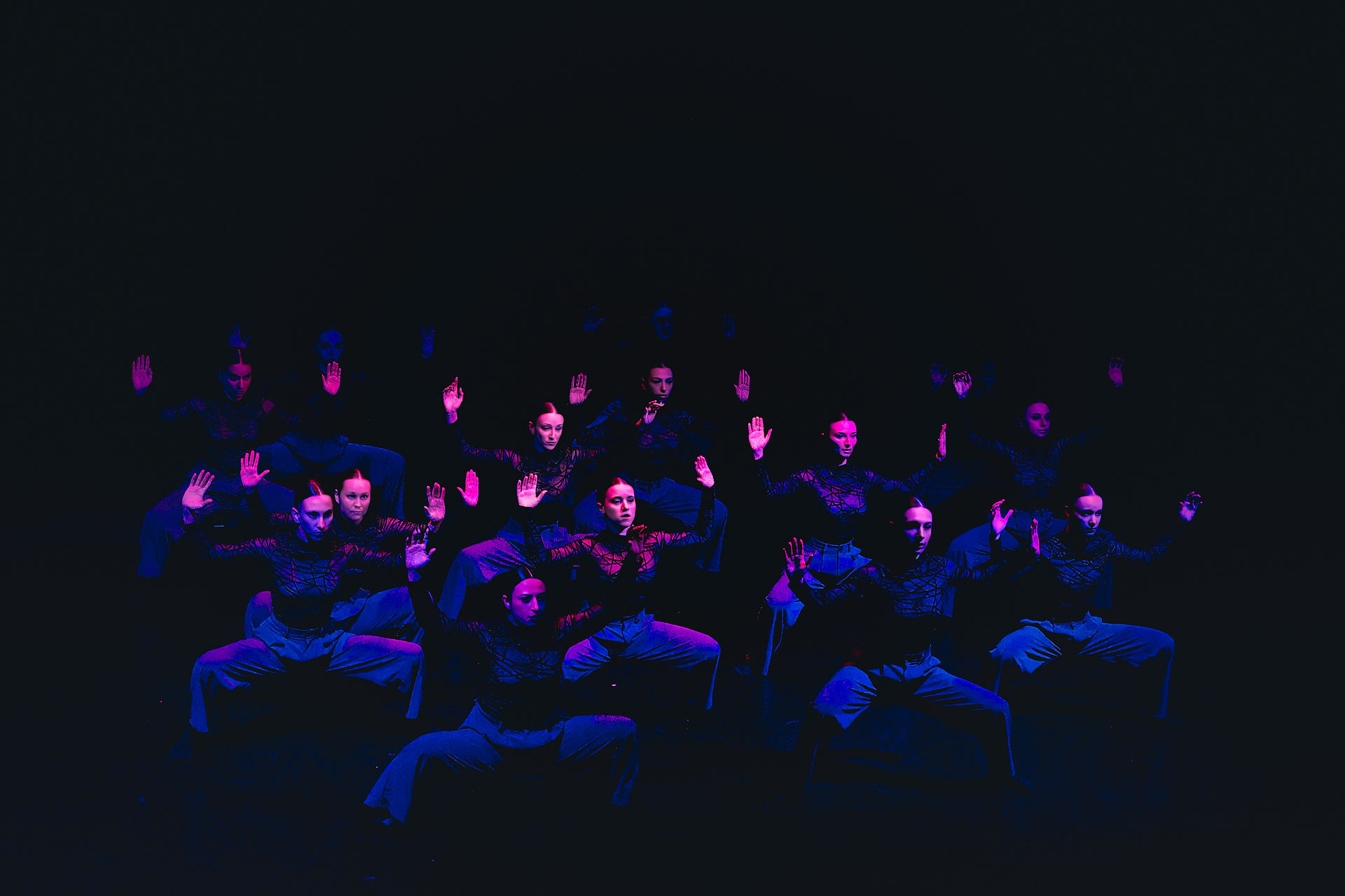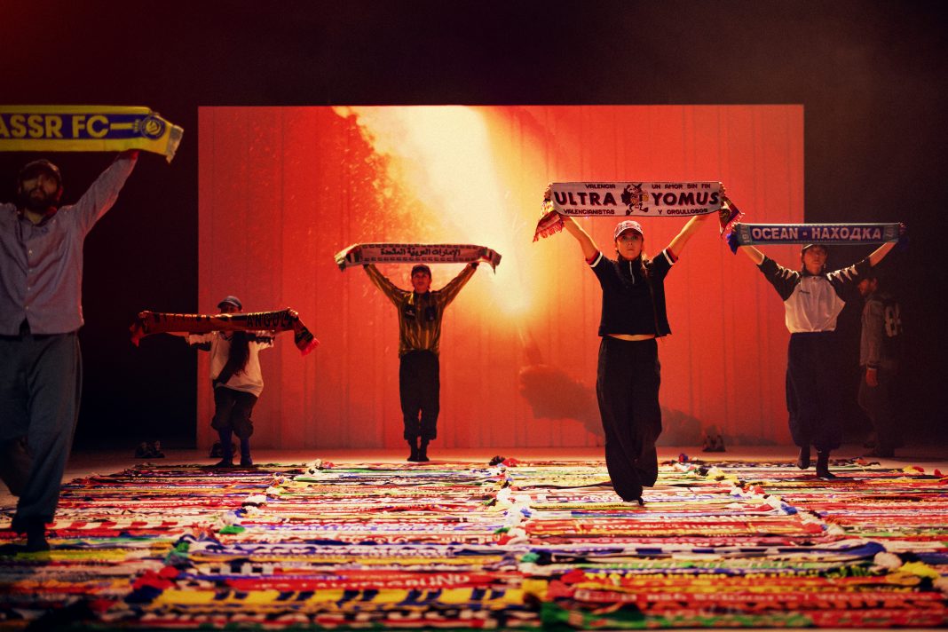 Sul palco, un accumulo di simboli: Juventus, Iran, All Blacks, Swifties, motti di provincia e slogan globali. Un paesaggio caotico che richiama la logica dei social media, dove il culto delle icone si intreccia con le tensioni politiche. I danzatori, in jeans e T-shirt, attraversano cori da stadio, video di partite, immagini di rivolte, mascotte e bengala. Le loro coreografie trasformano il fervore delle curve in un linguaggio fisico collettivo e identitario. Le sciarpe da tifoso possono essere maschere, bandiere, tappeti di preghiera o perfino armi dando vita ad un paesaggio in continua trasformazione.