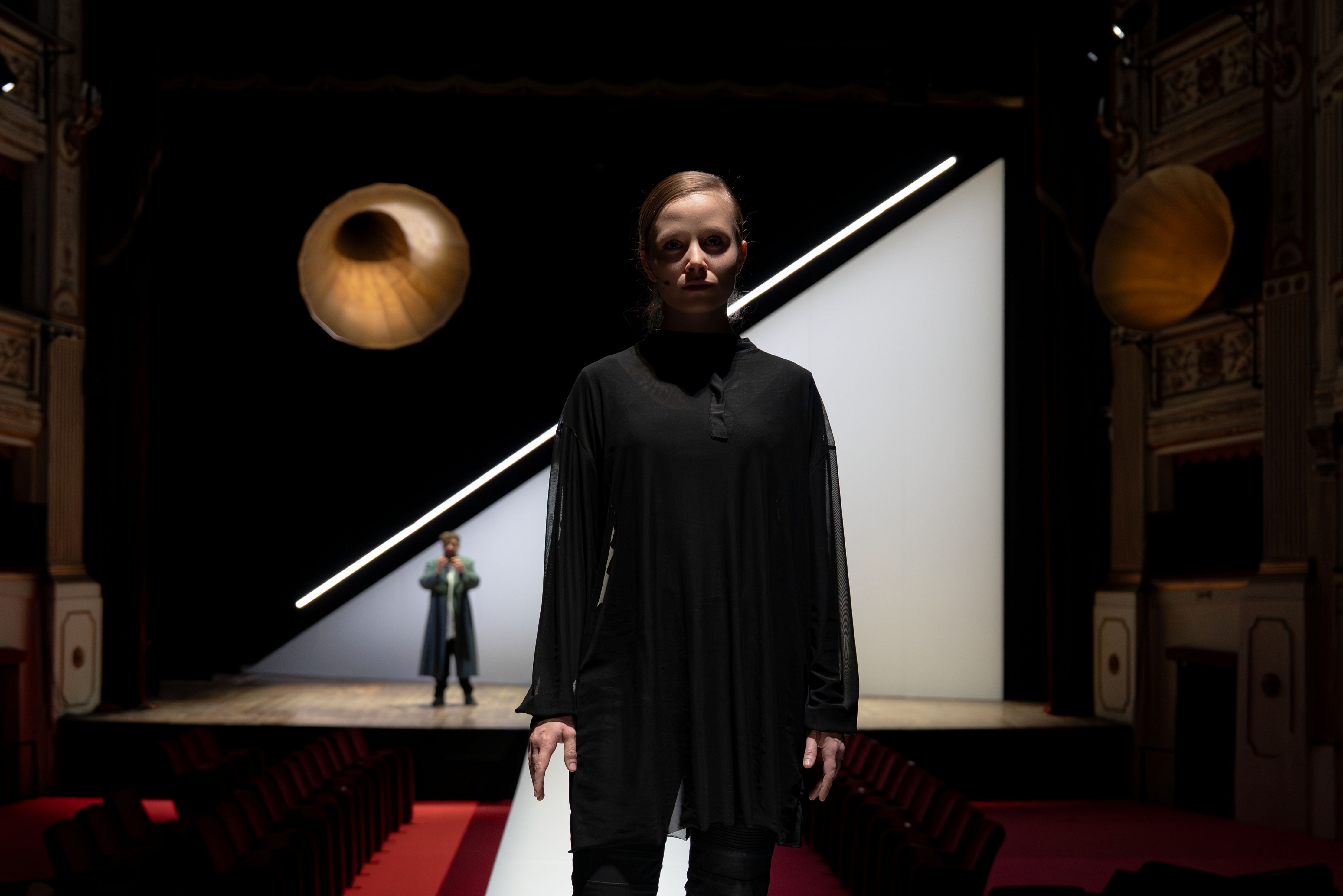 Giovanna sulla scena (Caterina Tieghi) è sola nel momento dell’accusa e in quello successivo della condanna, vicino a lei un Anonimo Cronista (Riccardo Goretti) che racconta la sua vicenda. Quasi un’ombra che incarna la voce del popolo, lo stesso popolo che l’ha innalzata e ora l’abbandona, implacabile nel giudicarne la disfatta.