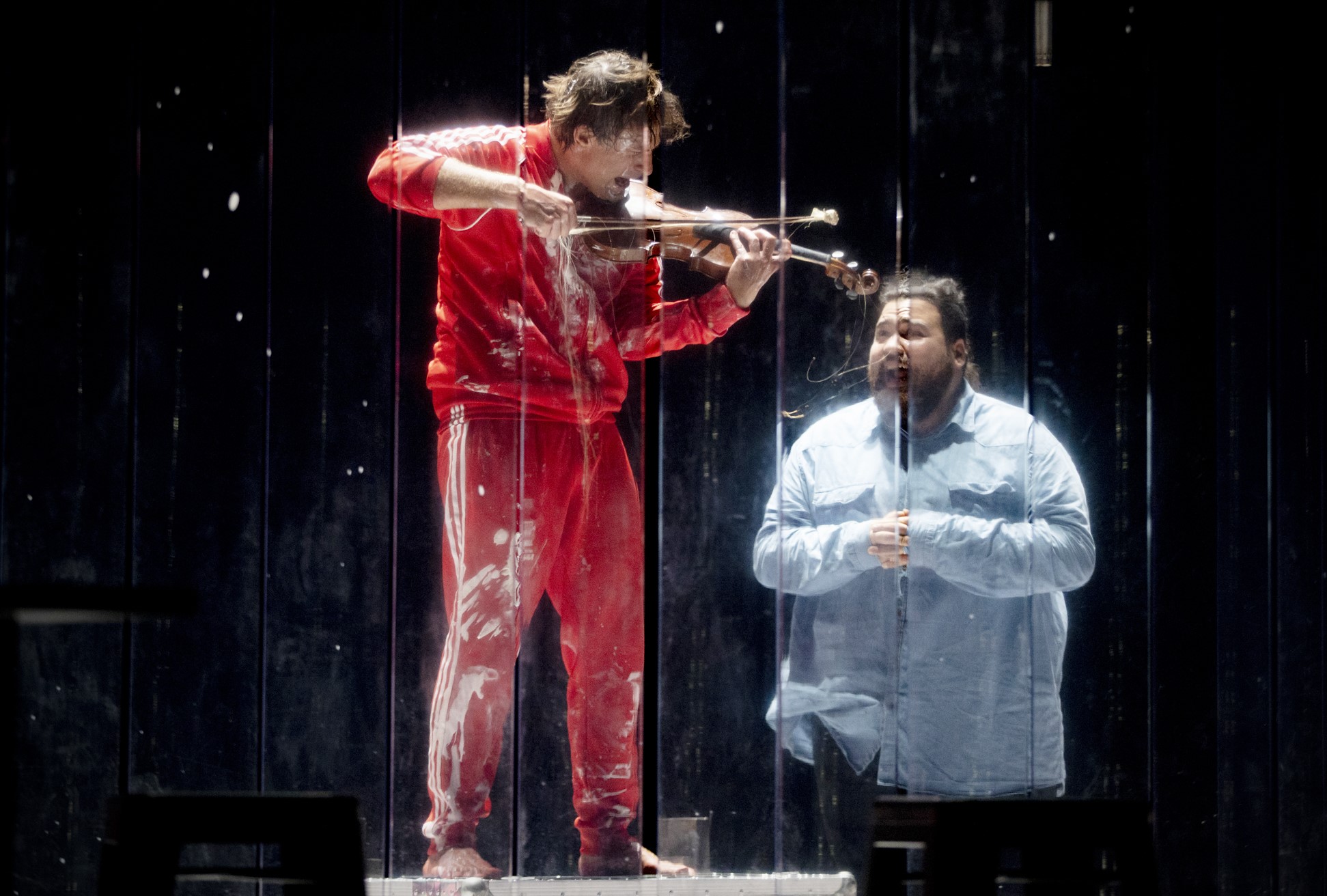 Immersi in un bagno di sudore, bruciando tutto l’ossigeno possibile, cantando, creando immagini e manipolando oggetti, cercheranno d’oltrepassare i propri limiti. Assieme, ingaggeranno una lotta contro il tempo, nel tentativo di trascendere il loro e il nostro corpo pensante.