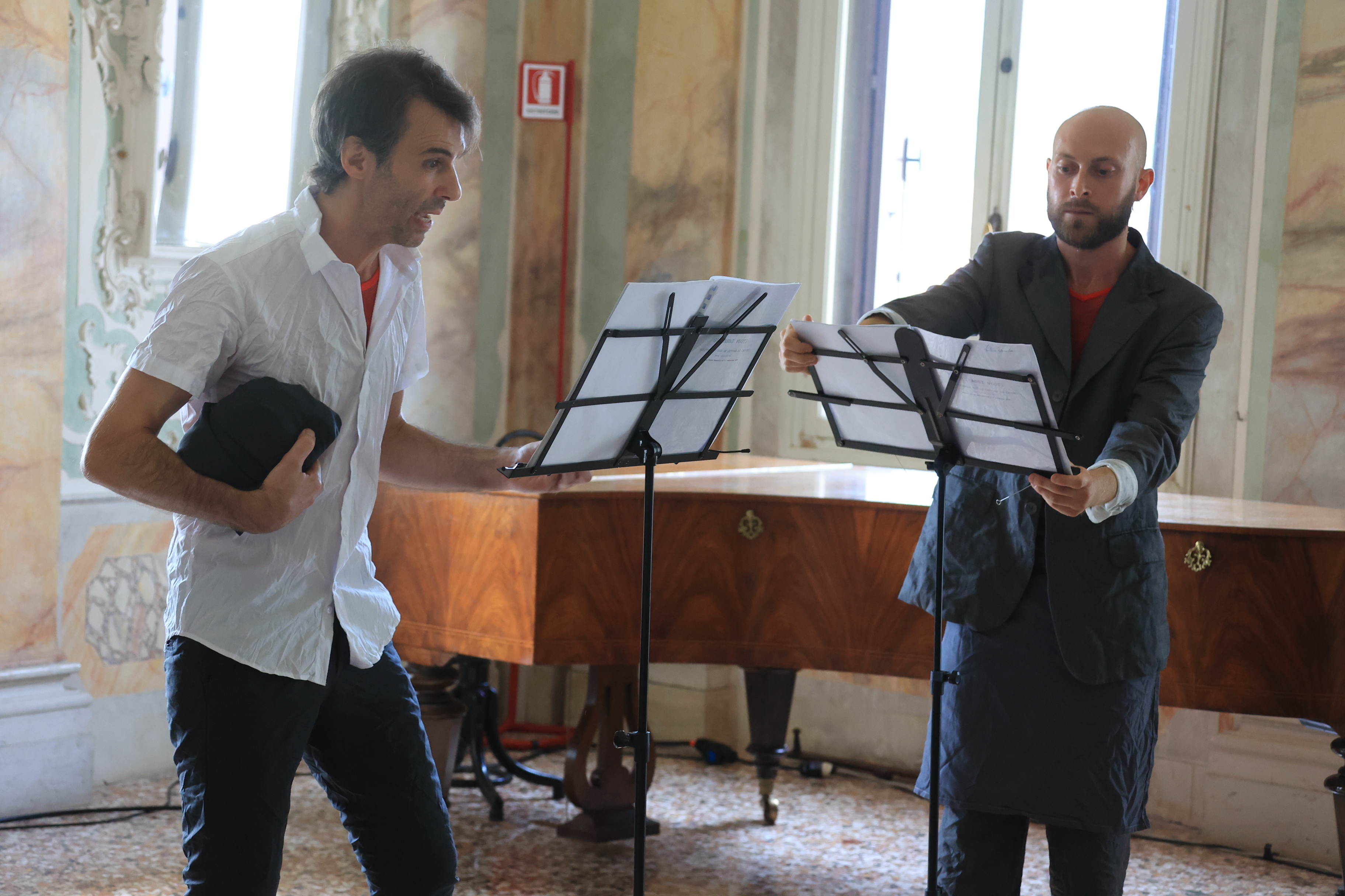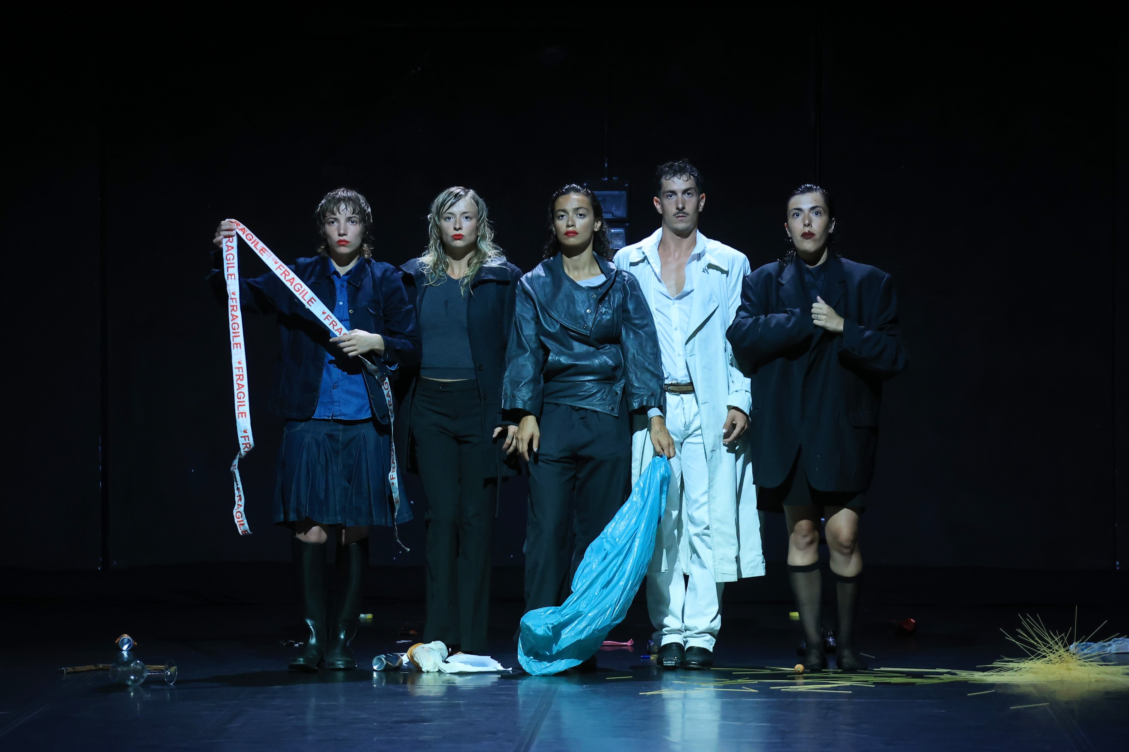È nella pratica della Compagnia far uso di elementi tipici del luogo dove si esibiscono, catturando situazioni e segni dalla realtà circostante. Qui mostrano e lasciano cadere a terra spaghetti, lattine, bicchieri, un ombrello, un quadretto con la foto di Giorgia Meloni, una bandiera della Palestina subito nascosta sotto il pastrano, giocattoli, bolle di sapone, fiori, nastri, e molto altro. Sono tracce del loro esserci, come se la risacca del mare, di cui udiamo lo sciabordio, le depositasse nella nostra e loro memoria.