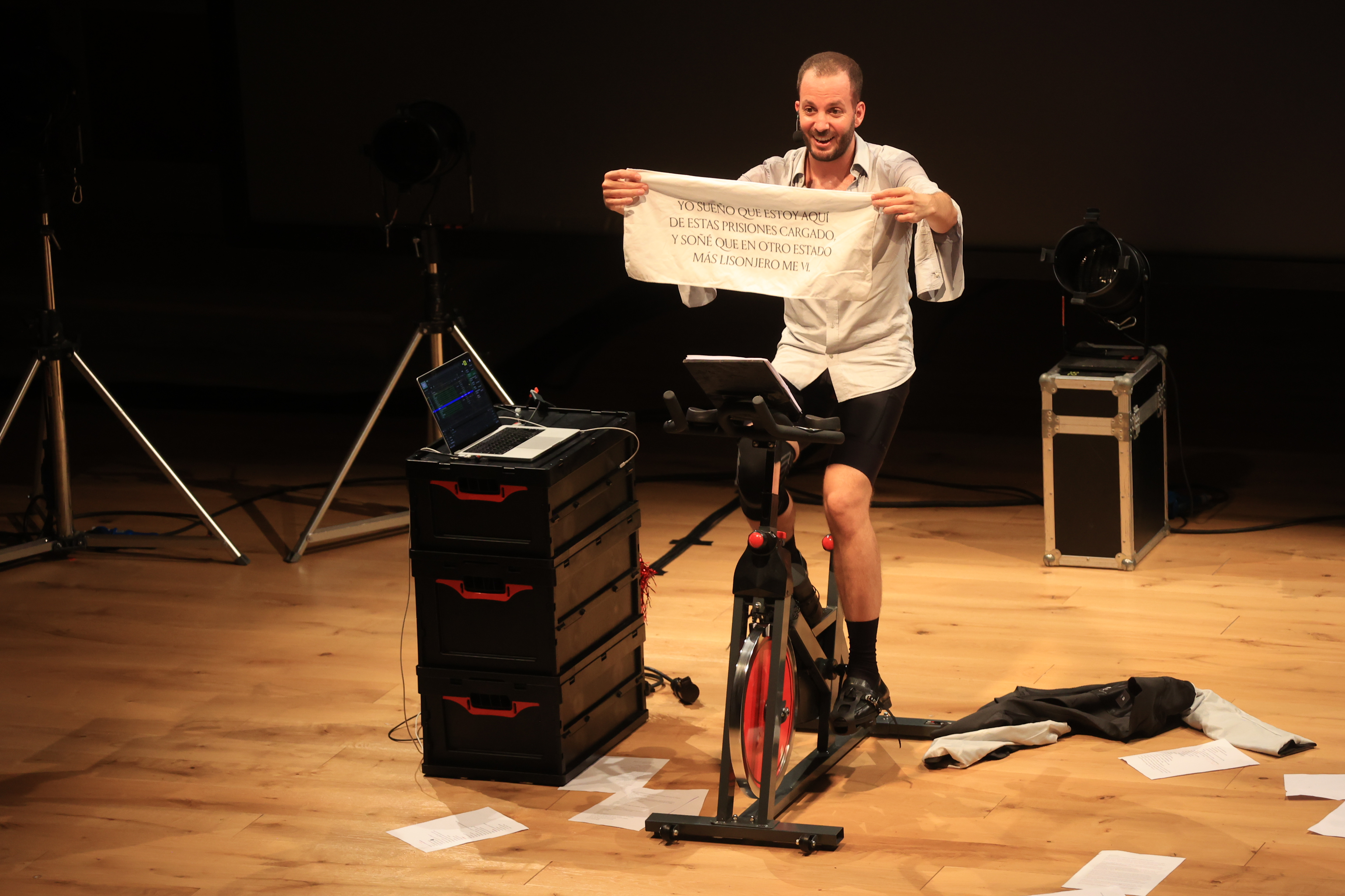 Moderno Sisifo, costretto a pedalare all’infinito tra una lezione di spinning, pause monologanti, video, oratoria spicciola e performativa, dialogo col pubblico per coinvolgerlo nei suoi deliri di vita quotidiana iperattiva, lo spagnolo Sergi Casero trasforma via via il suo ironico spettacolo No pares, sigue sigue – “…strategie di resistenza per rompere l’inerzia della iperproduttività e dei suoi meccanismi di seduzione” – in una performance caciarona che ingloba parte degli spettatori in una baldoria finale estenuante.