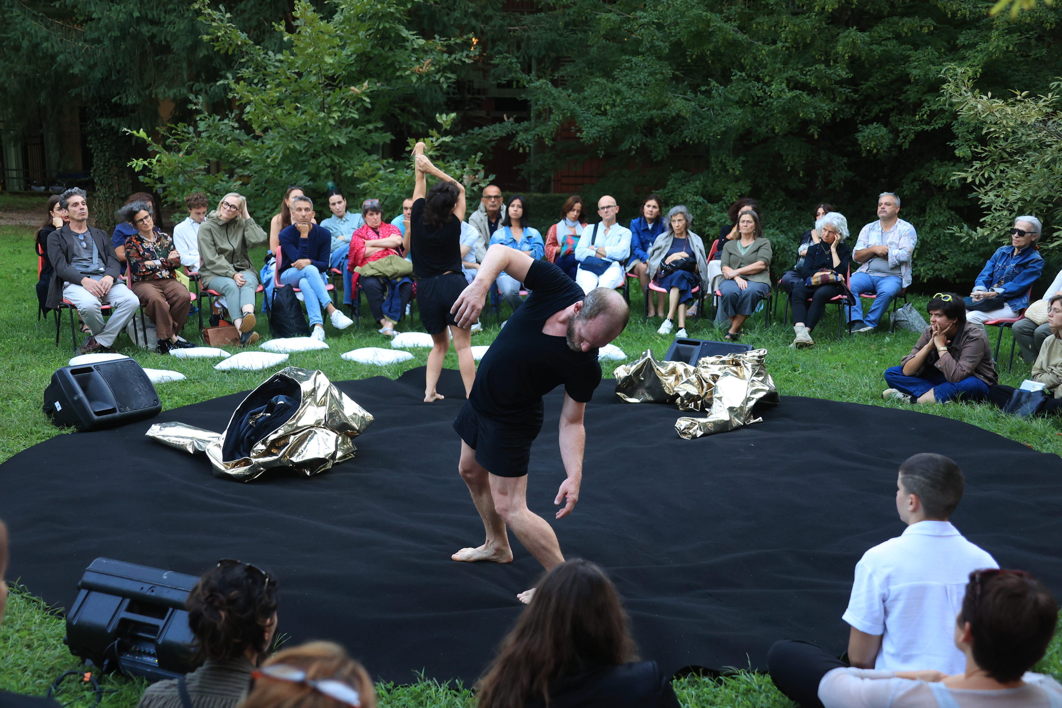 La casualità delle forme, la “possibilità di un corpo di diventare paesaggio, superficie per l’iscrizione di diversi modi di esistere”, è quanto sperimentano e indagano di volta in volta Demestri+Lefeuvre in Troisième Nature, chiusi dentro due modellabili tute dorate e specchianti, poi dismesse nell’uscita come larve dall’involucro, osservati dal pubblico attorno nella loro lenta e trasformativa metamorfosi.