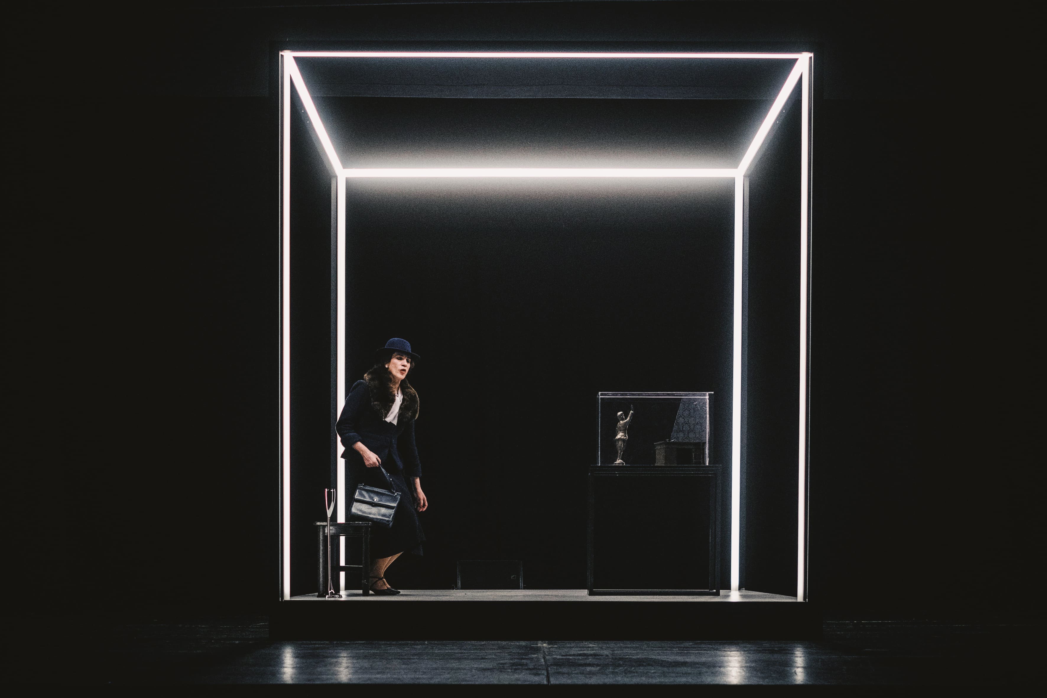 Al Teatro Franco Parenti di Milano ha debuttato Sarfatti, l’opera nata da un’idea di Massimo Mattioli e Claudia Coli con la regia di Andrea Chiodi. Un ritratto intimo e complesso che intreccia la grande storia italiana con il contributo della visione artistica della curatrice e, soprattutto, con i suoi dilemmi personali. Coli, in un elegante completo blu in tinta con la omonima sala che ospita la rappresentazione, propone il suo monologo inserita in un cubo di luce, pensato da Orlando Cainelli a incorniciare una scena minimalista, in cui campeggiano solo una sedia e un tavolo con una teca che contiene una statuetta del Duce, disegnata dallo scenografo Guido Buganza.