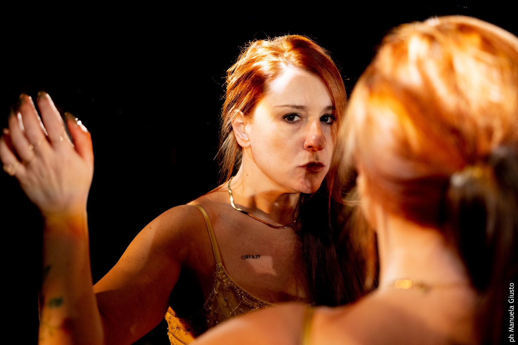 Smessi i panni maschili, in “Medea”, invece, l’attrice assume un dialetto meridionale per esporre la condizione di una donna asiatica finita in galera, intenta a esporre, con gesti sboccati e sfidanti, la diversità di leggi e di trattamento per gli stranieri e per quelli del posto. Con un gergo da strada da bassifondi contemporanei, e indossando pantaloni da tuta con un luccicante abito succinto che lascia scoperta la pancia, la donna, con veemenza crescente, sputando e urlando, se la prenderà con una ipotetica secondina e contorno di recluse; ripercorrerà l’amore e il tradimento, parlerà di figli e mariti da tenere alla larga, prenderà una mazza nel delirio finale, picchiando a terra e rompendo lo specchio nel quale si era prima guardata.