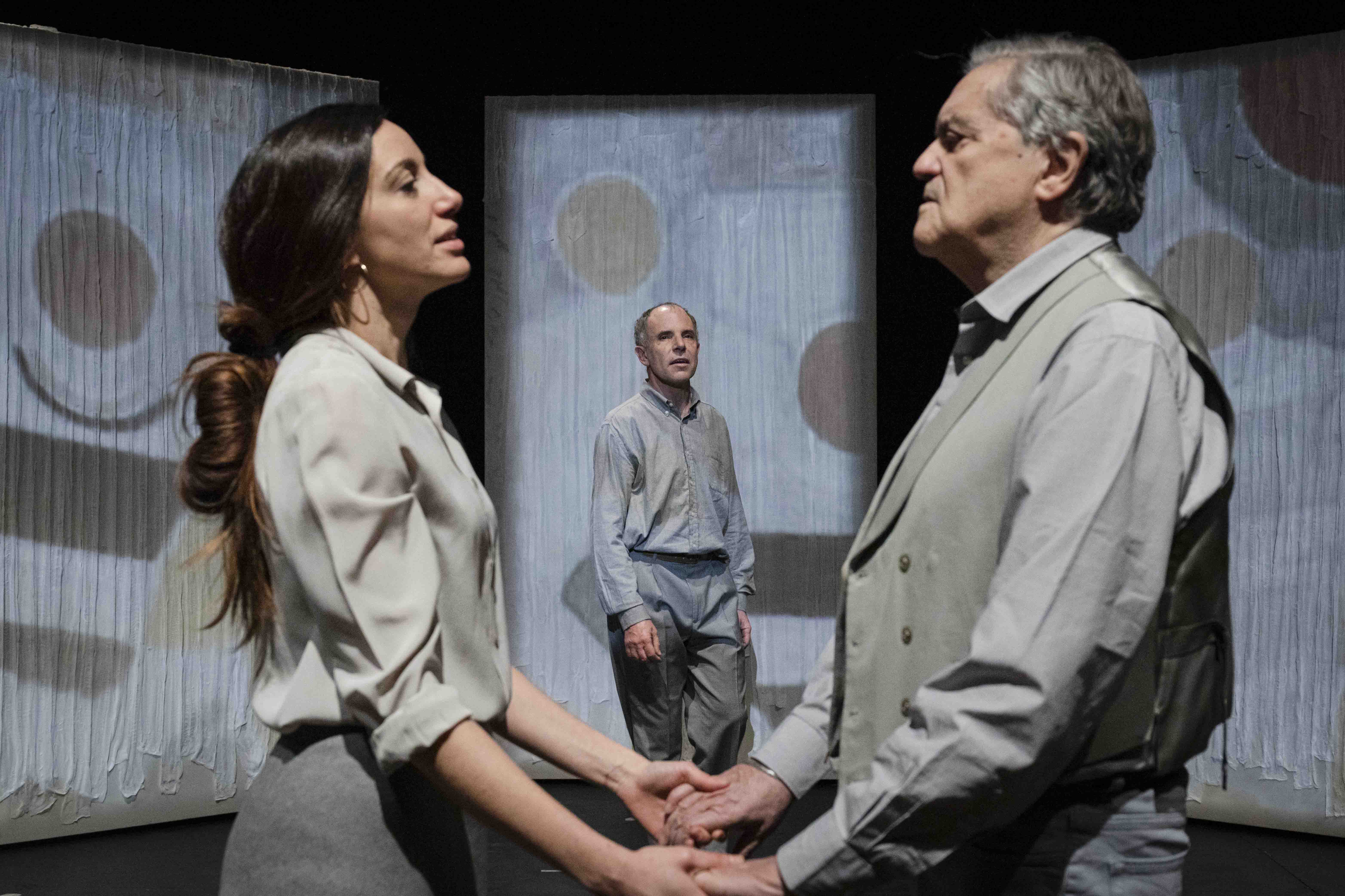 Tre sono gli attori e una spiega proiettata prima ci spiega che si tratta di tre versioni della stessa persona, Vitaliano Moscarda, Gengè per gli amici, suddiviso tra se stesso, interpretato da Gaetano Callegaro, un alter ego, Mario Sala, e una versione femminile, Stella Piccioni. Gengè è un uomo sulla sessantina, il protagonista vecchio ormai. Di lui ricordo la spalla contratta, la striscia chiara di pelle glabra che fa capolino dall’ultimo bottone della camicia e il braccialetto di metallo. È uomo e bambino allo stesso tempo che poco sa di sé e spesso deambula su di un girello. L’altro, la stessa erre moscia di mio padre, mia figlia l’ha subito notato, ha due occhi accesi e il dono di interpretare personaggi tra loro molto diversi e incompatibili, è ora vescovo, straccione o scaltro uomo d’affari. Che la r moscia l’avesse solo il personaggio uno? E lei, è Dida, la moglie, l’altra da sé, la bellezza accesa, la sabiduría della signora di famiglia e un fischio davvero molto prepotente. Anche infermiera e amante. La stessa borghesia indolente che qualche anno dopo diventa protagonista degli Indifferenti di Moravia.