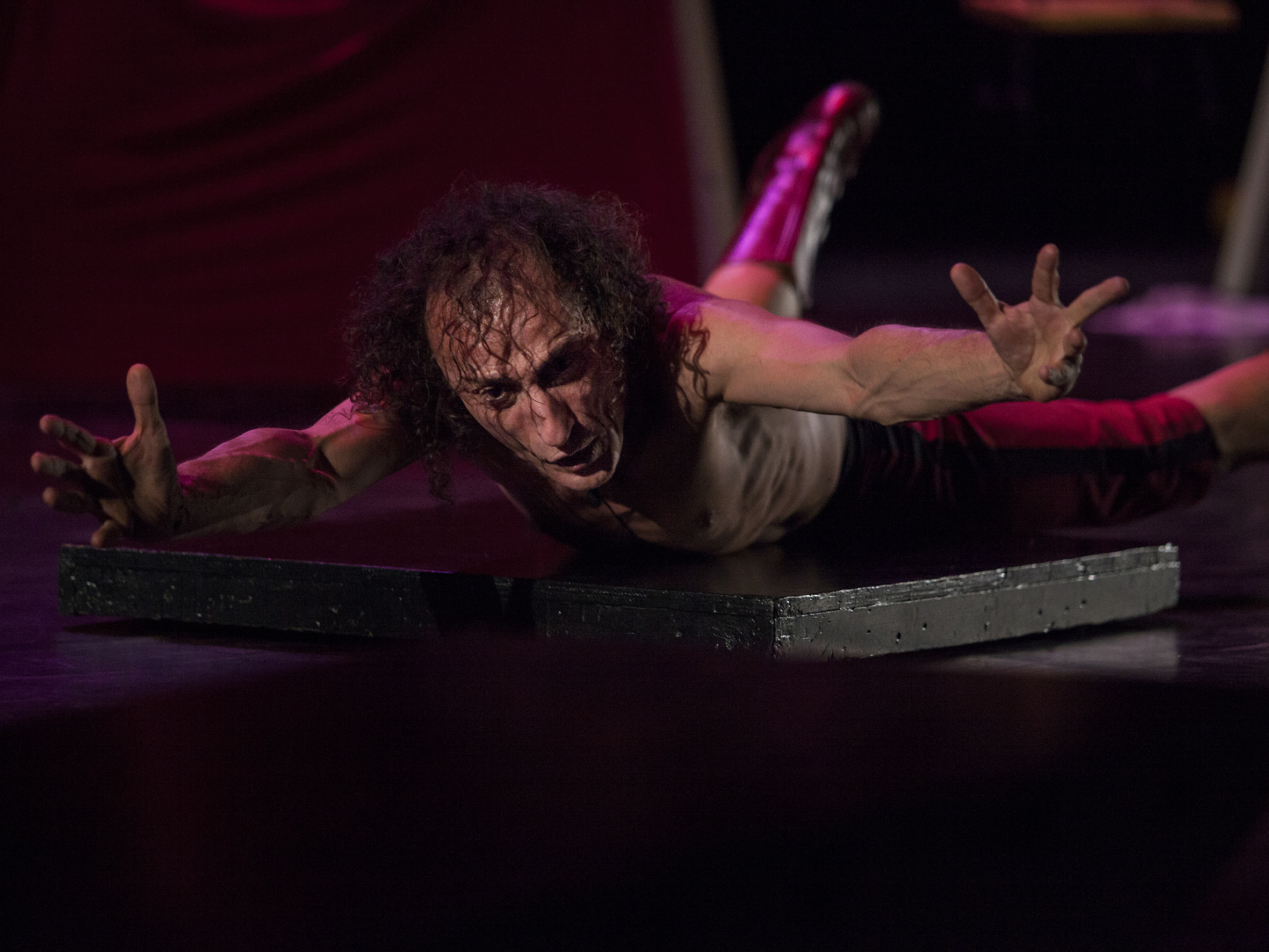 La fisicità dirompente di Rezza ancora una volta s’infrange su di noi come un’onda anomala, stavolta partendo da un’altalena, da quella che pare la struttura di un parco giochi per bambini a cui lui s’appende e ci mostra per cominciare l’evoluzione di un uomo attraverso la medicina. Per così dire. Descrivere uno spettacolo (mai scritto) da Rezza è al limite dell’impossibile. Questo lo potremmo dire surreale, ferocemente comico, irriverente e blasfemo e rosso.