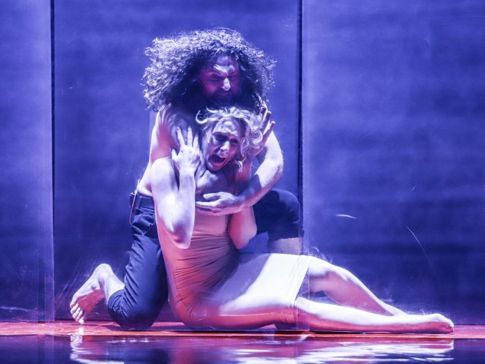 Non basta un impianto figurativo (di Nelli Pallós) simile a un set da discoteca (?) con luci e tende di plexiglass trasparenti da dove si entra e si esce, si accenna a balli, e con una Dj alla consolle, Flóra Lili Matisz, che crea le musiche e i suoni live, oltre che cantare. Jago, istrione spudorato che, a tratti, usa anche una maschera nera per avvalorare la sua recita – «Un illusionista», lo descrive la regista -, cerca l’applauso del pubblico in platea, sgambetta e si muove consapevole del suo fascino ammaliante.