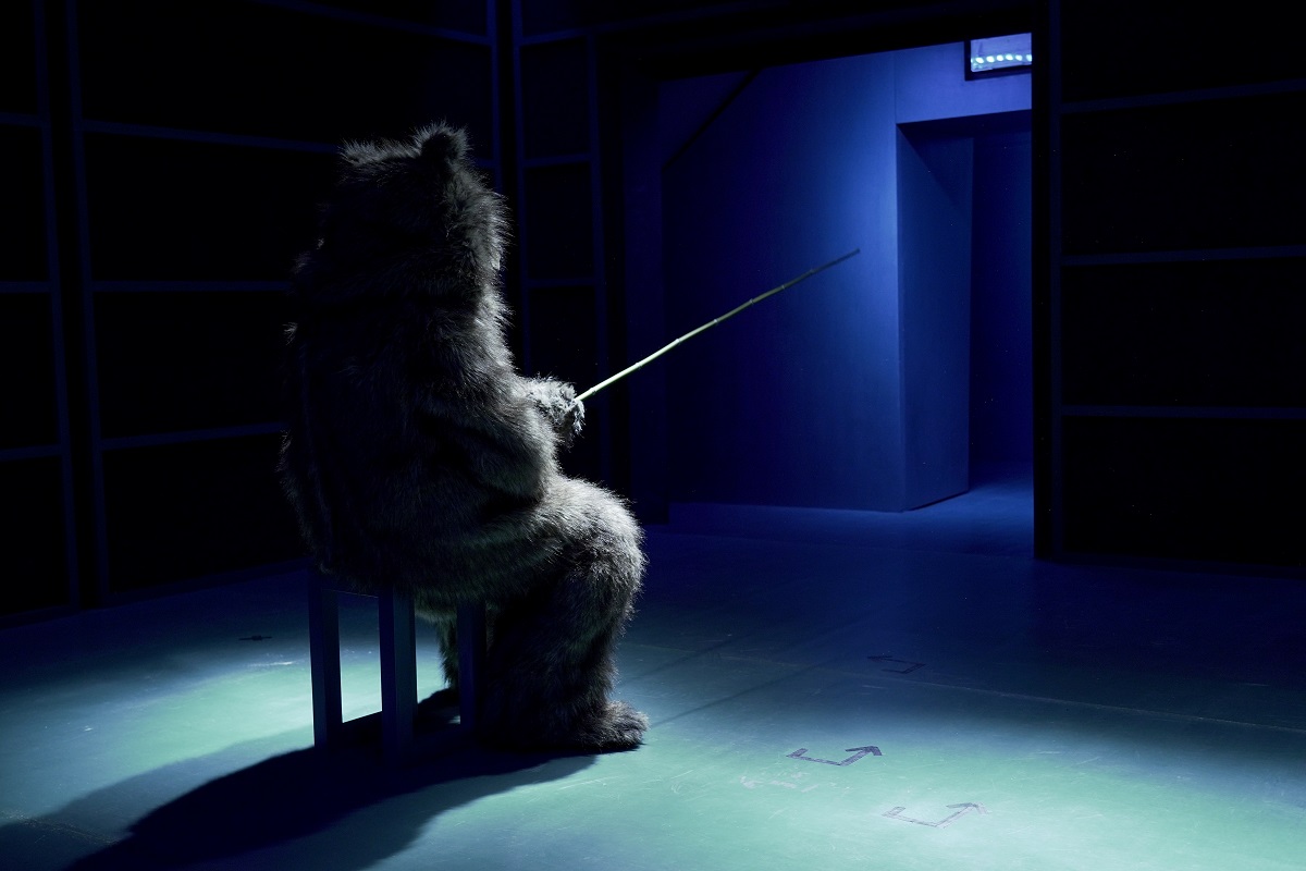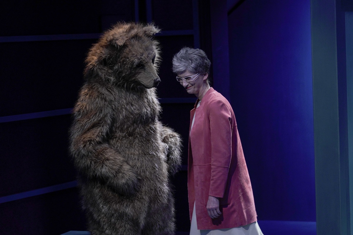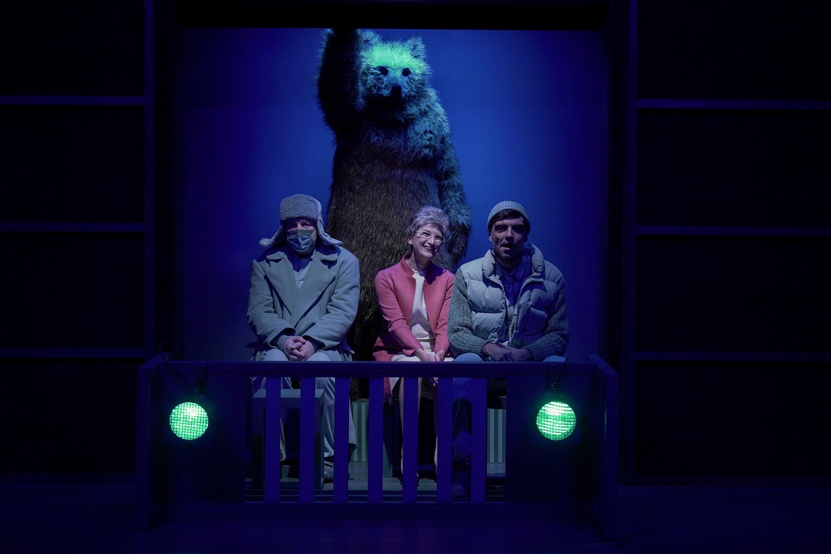 Che siamo in un paese nordico lo dicono brevi cenni musicali e una voce che ricorda quella della cantante islandese Björk, ma specialmente l’azzurro con gradazioni di ghiaccio degli accurati costumi e quello dell’ambiente con un mobilio e oggetti dello stesso colore sfumato. Nel mezzo della scena campeggia una porta. Essa, manovrata a vista, determina il corso del tempo aprendosi e chiudendosi all’apparizione dei personaggi. A muoverla è un grande orso umanizzato, sensibile agli eventi e alle persone, che osserva, ci guarda, si muove ai cenni della narratrice la quale spicca per l’elegante vestito rosso. Il suo racconto in un futuro possibile, di un passato che non ha mai vissuto, di una pandemia che è ormai mito, è scandito da improvvise brevi pause che bloccano i personaggi in pose da fermo immagine come quelle di un film che possiamo fermare e far ripartire a nostro volere – le esegue l’orso -, ma agìto realmente da persone in carne ed ossa.