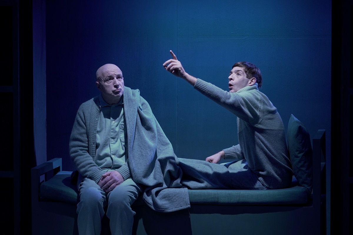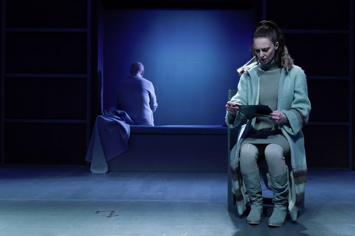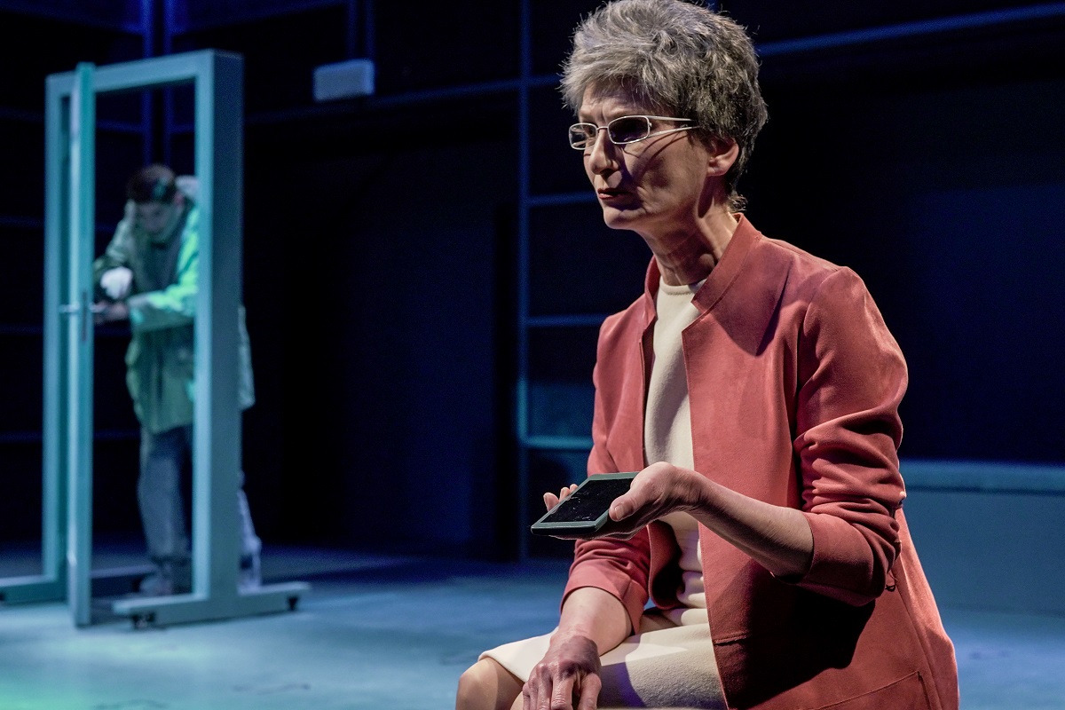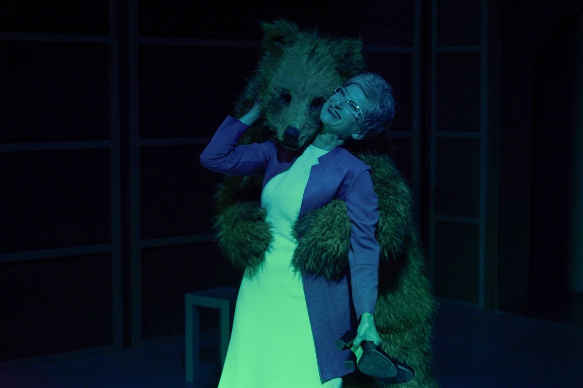 Che siamo in un paese nordico lo dicono brevi cenni musicali e una voce che ricorda quella della cantante islandese Björk, ma specialmente l’azzurro con gradazioni di ghiaccio degli accurati costumi e quello dell’ambiente con un mobilio e oggetti dello stesso colore sfumato. Nel mezzo della scena campeggia una porta. Essa, manovrata a vista, determina il corso del tempo aprendosi e chiudendosi all’apparizione dei personaggi. A muoverla è un grande orso umanizzato, sensibile agli eventi e alle persone, che osserva, ci guarda, si muove ai cenni della narratrice la quale spicca per l’elegante vestito rosso. Il suo racconto in un futuro possibile, di un passato che non ha mai vissuto, di una pandemia che è ormai mito, è scandito da improvvise brevi pause che bloccano i personaggi in pose da fermo immagine come quelle di un film che possiamo fermare e far ripartire a nostro volere – le esegue l’orso -, ma agìto realmente da persone in carne ed ossa.