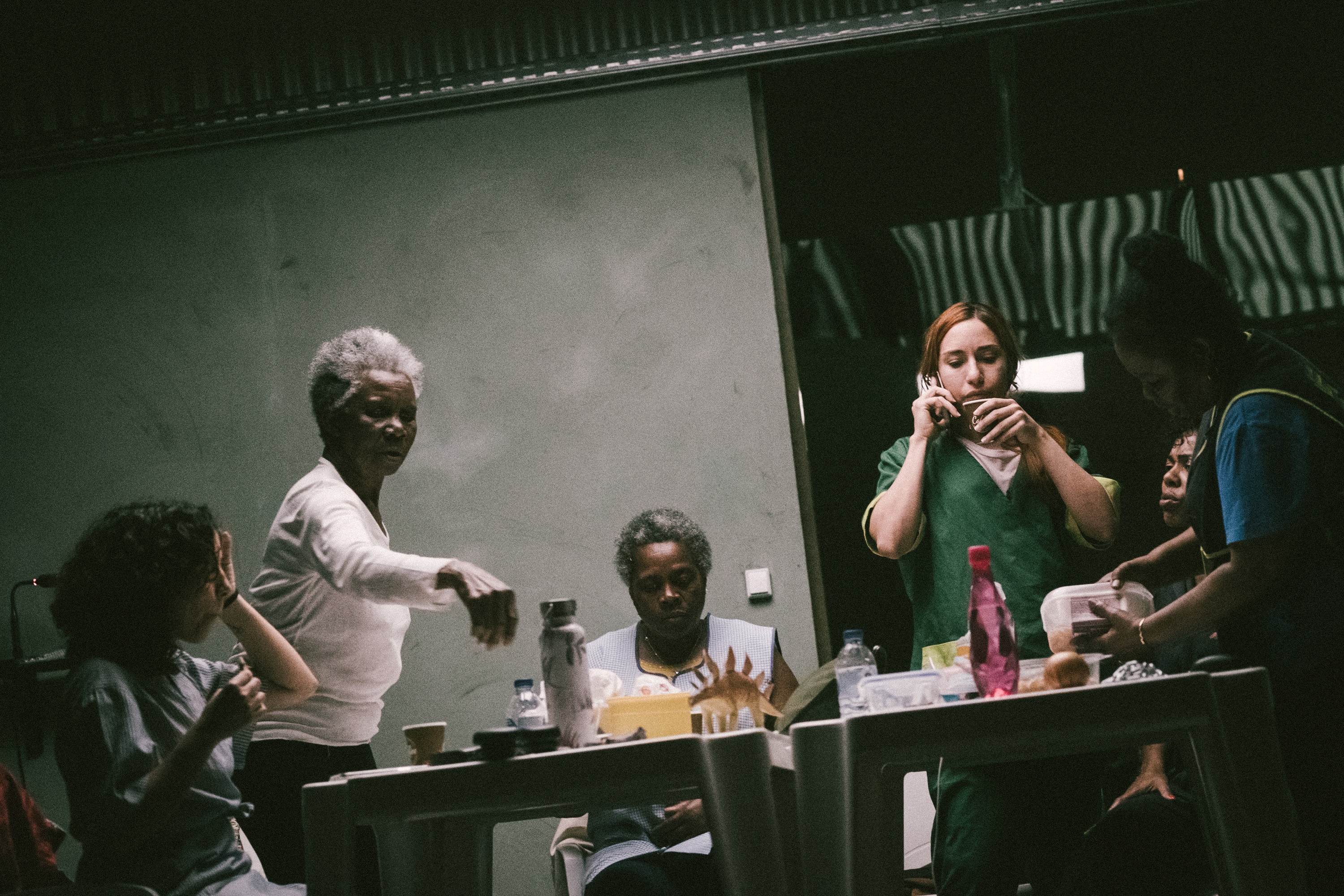 Nel caso specifico di Lisbona, le collaboratrici domestiche provengono per lo più dal Brasile o dai Paesi africani di lingua portoghese, come Angola, Capo Verde, São Tomé, Mozambico o Guinea. Le sette donne di diverse età, immigrate di prima o seconda generazione – attrici non professioniste bravissime, coinvolte dal regista in sei mesi di lavoro condiviso -, portano in scena il vissuto reale di abbandoni, di fatiche e speranze. Si(ci) raccontano nell’affollato via vai di un grande stanzone con una saracinesca centrale e delle porte laterali – siamo nel retro di un supermercato con una parete mobile che, dividendo lo spazio crea un altro ambiente più intimo -, condividendo tra una pausa e l’altra, pensieri, sogni, aspettative e storie di chi ha dovuto lasciare i luoghi d’origine e i propri affetti, in cerca di un futuro migliore, costrette per necessità a prendersi cura di persone sconosciute. E in noi, nell’ascolto e nella condivisione del trapelare pudico o crudo dei loro sentimenti e del loro operare di badanti, si addensano emozioni contrastanti.