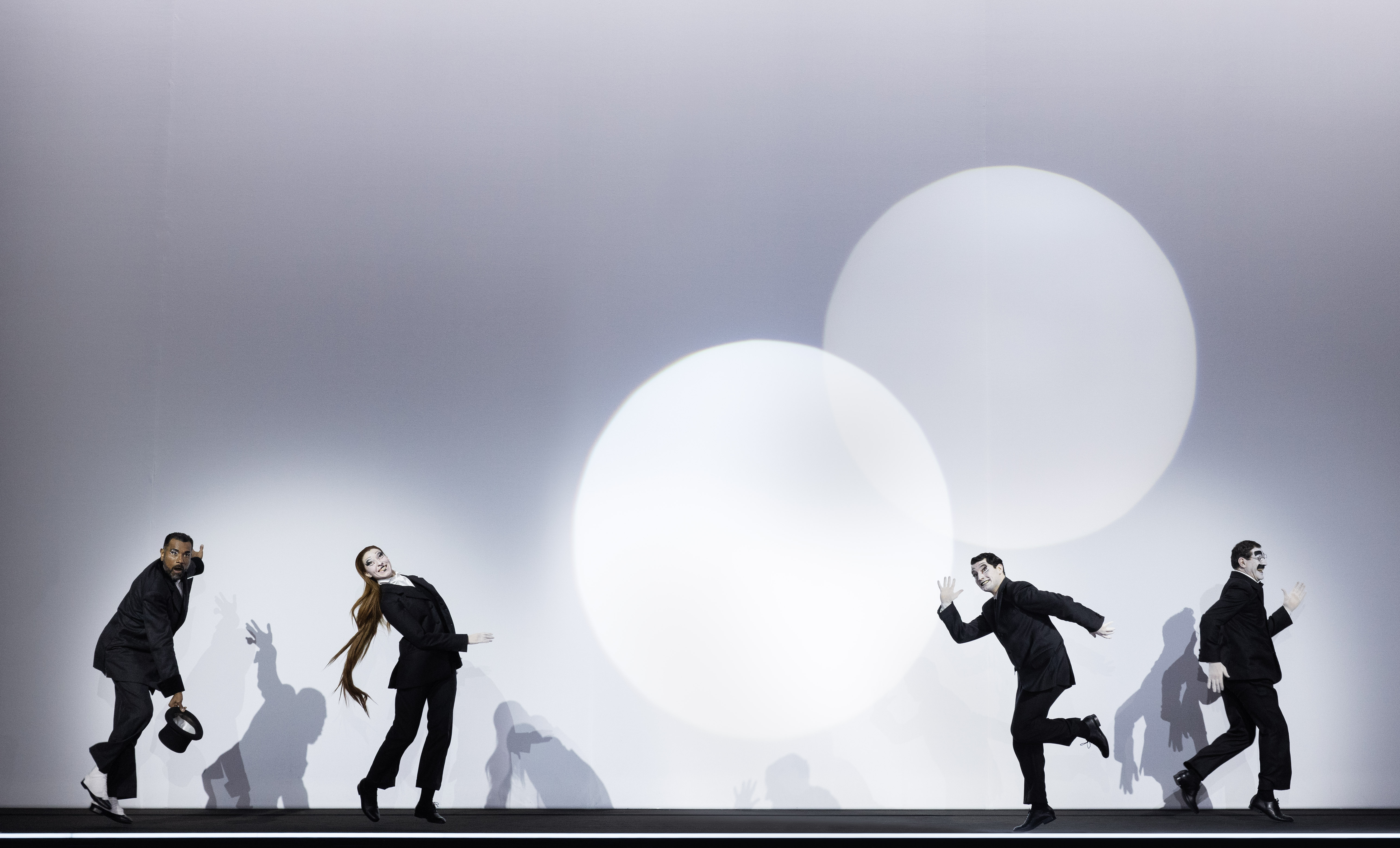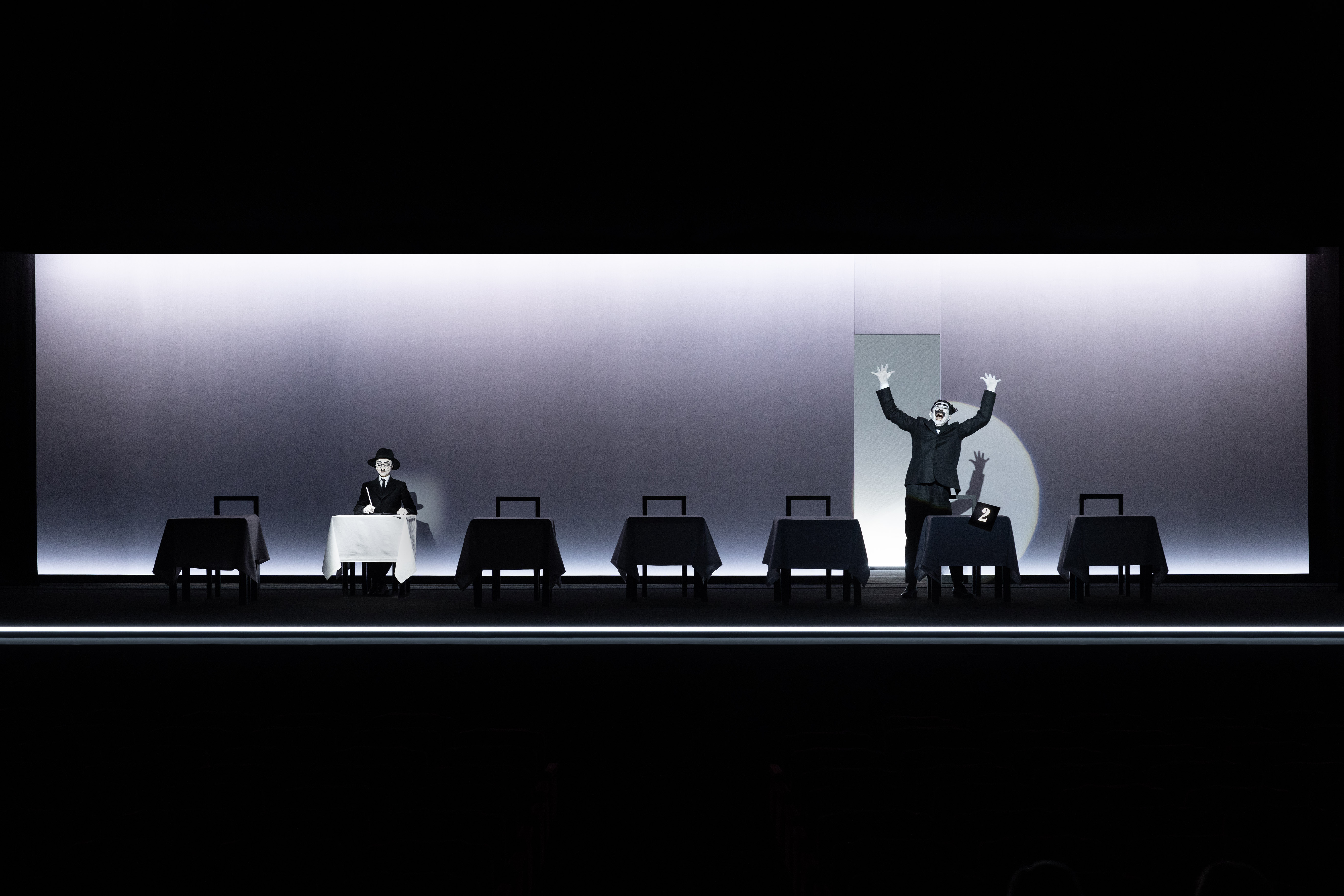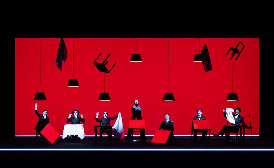 I versi poetici, a mo’ di monologhi, scorrono da un personaggio all’altro, rimbalzano sulla bocca dei sette performer che scomponendosi recitano nelle diverse lingue praticate da Pessoa: il portoghese, il francese, l’inglese e l’italiano. Sono passaggi staccati che raccontano, anche col suono dei diversi idiomi, la sua esistenza. La evoca, insieme ai suoi stati d’animo, creando un mondo onirico, il regista Wilson del quale ritroviamo il raffinato formalismo da tutti conosciuto, con le sue luci dai colori accesi (folgorante l’improvviso accendersi del rosso in una delle sequenze dello spettacolo), il nitore del segno grafico delle sue scenografie col trascolorare lucente dei fondali davanti ai quali si stagliano figure illuminate per intero o sui volti, o che procedono in controluce, in abiti neri sul fondale bianco.