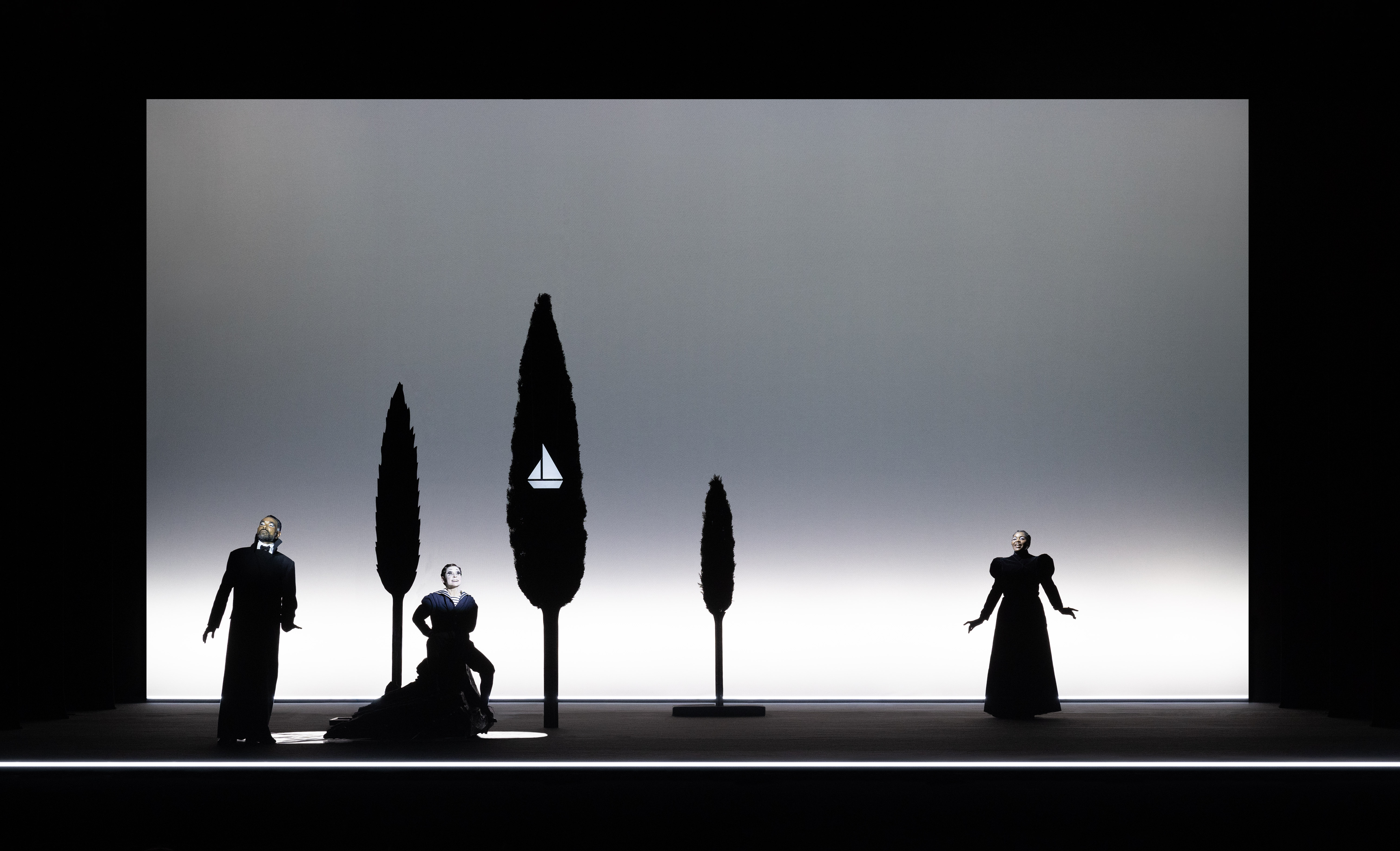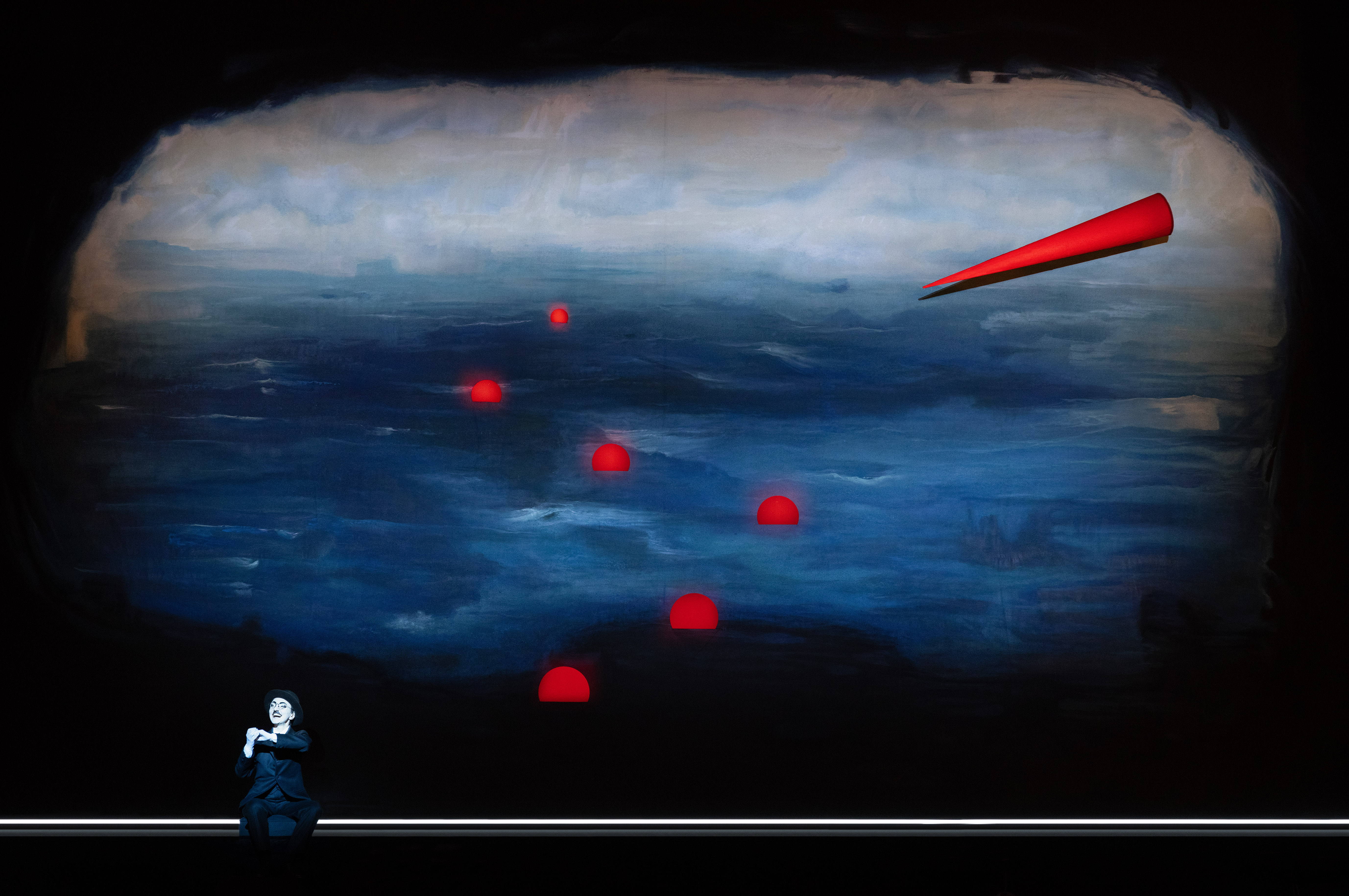 Oggetti simbolici riempiono la scena – una serie di tavoli e di sedie in fila che prenderanno il volo insieme alle tovaglie, una grande barca a vela stilizzata ed una in miniatura che vaga sospesa, una macchina da scrivere dal continuo ticchettio, alcuni cipressi, torce elettriche che scandagliano il buio -, mentre un grande uccello e un riccio la attraversano. Il tutto tra folate di musica, blues e sonorità cupe, rumori di vetri infranti che scandiscono il ripetersi delle frasi, stridii, esplosioni improvvise, pioggia scrosciante.