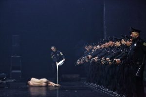 Una massa di agenti con la divisa da poliziotto americano tipica degli anni ’20, si muove schierandosi in file compatte, in schieramenti frontali o di gruppi, in parate con grandi manifesti funerei con scritte e immagini, compiendo una serie di azioni. Alcune molto violente. Una di queste è l’insistita sequenza di un uomo nudo a terra percosso ripetutamente col manganello dai colpi amplificati. Altre vedranno imbavagliamenti, pistole puntate, blocchi, umiliazioni, soffocamenti, pestaggi e altre sevizie, tutte eseguite freddamente come se fosse un codice naturale inscritto in quegli uomini. “Sono disposto a diventare un poliziotto in questo spettacolo”. “Eseguirò gli ordini anche se mi esponessero alla vergogna,…anche se mi sembreranno contraddittori”. “Non guarderò mai negli occhi i miei colleghi”. “Eseguirò gli ordini come una statua classica, anche se non capisco questa frase”. “Eseguirò gli ordini come fossi ferro-cianuro di potassio, anche se non capisco questa frase”. E infine “L’esecuzione degli ordini sarà la mia oblazione, il mio teatro”.