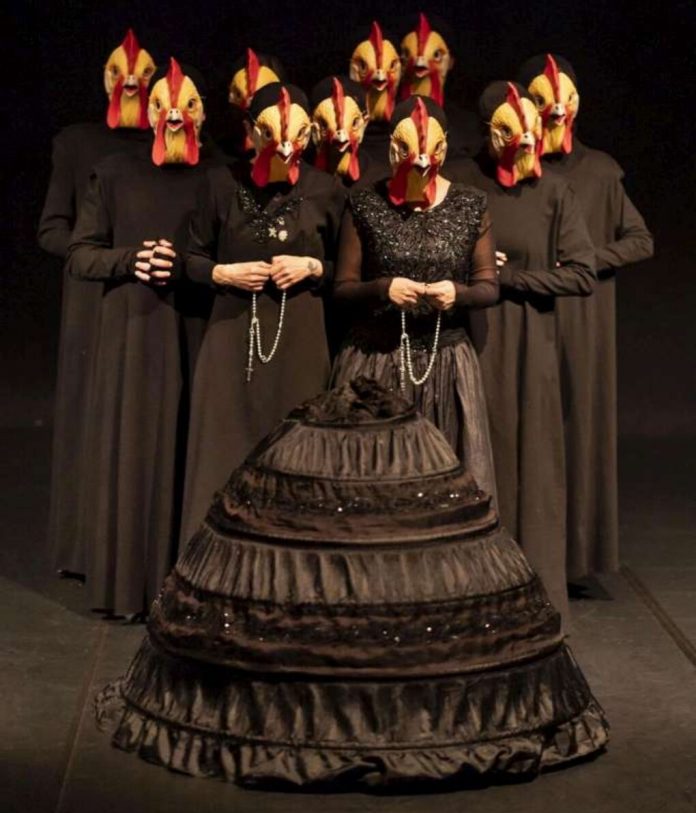 La prima sequenza è folgorante: il buio che si apre lentamente rivelando un gruppo compatto di “pennuti” – maschere di galline per la precisione, che coprono il volto degli attori -, con rosari in mano, recitare, tra movimenti a scatti della testa e versi dei loro becchi, una litania incomprensibile di preghiere. Sostano davanti a un’ampia gonna nera di penne, che si muove a terra. Da lì uscirà, sforzandosi, prima la testa, poi il torso nudo di Re Chicchinella aiutato da alcuni servi, pronti a pulirlo nei lavacri quotidiani. Con fatica e dolore però, tra spasmi e contrazioni. Perché il sovrano ha un grosso problema fisico dovuto all’aver introdotto nel suo orifizio, per svista nel ripulirsi con delle piume dopo aver defecato, una gallina viva ma creduta morta. La particolarità della pollastra è che ogni giorno, se nutrita, cova delle uova d’oro.
