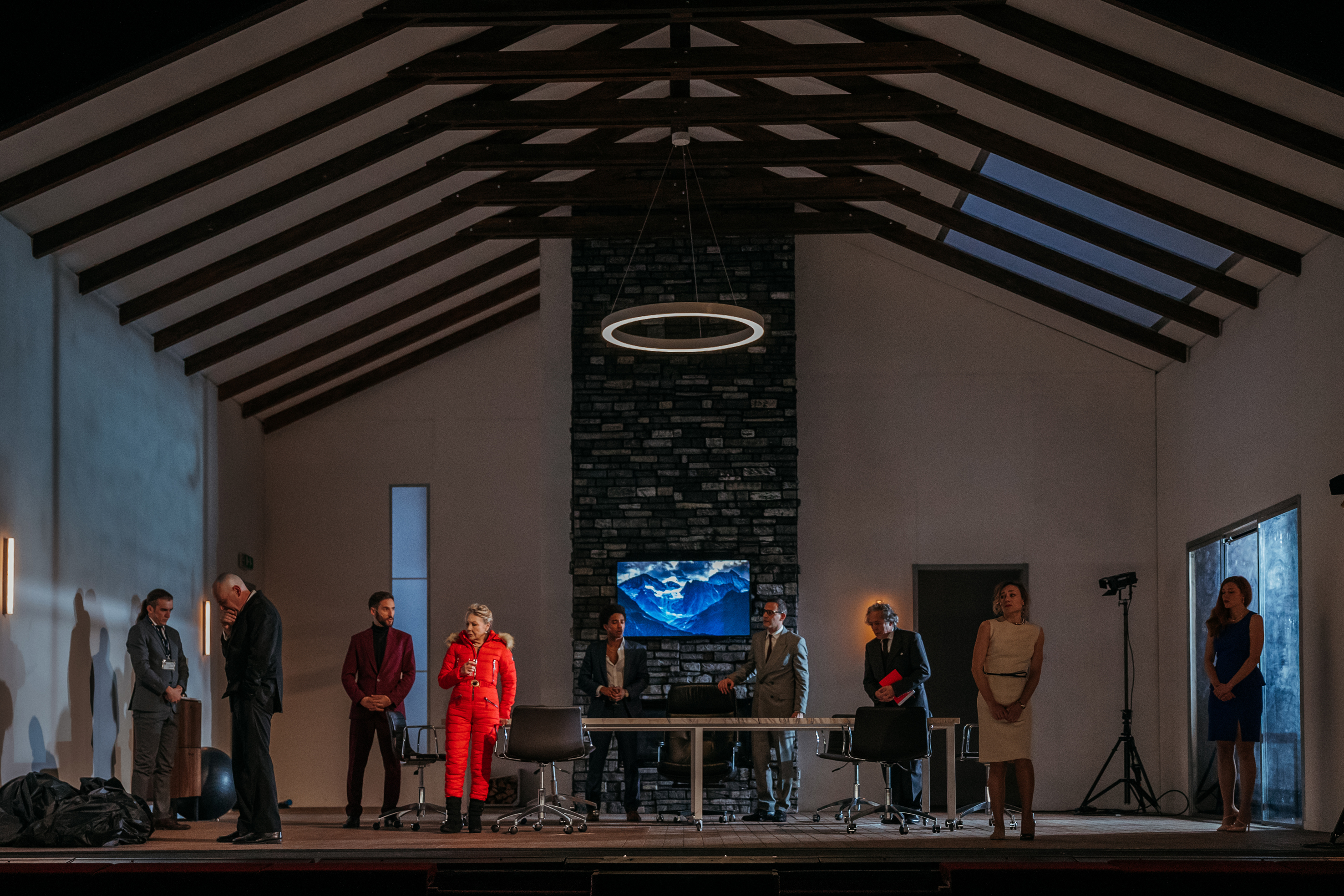 All’insegna di un’attualità più che manifesta, e infarcendo i dialoghi di uno slang che tutti usiamo, Székely mette insieme famiglia e mafia finanziaria, social, giornalismo e geopolitica, con chiari riferimenti alle tensioni in atto – citati Ucraina, Russia, Cina, Corea, Iran. Nella scena fissa di un grande stanzone moderno che è casa, studio aziendale, baita (in un televisore fisso le immagini delle Alpi bavaresi, riferimento allo chalet che fu l’ultimo rifugio estivo di Hitler), il suo Riccardo in abiti eleganti – come tutti i personaggi – si muove tra set televisivi, manipolazione dei media e fake news, macchinazioni e corruzione a più livelli, in un continuo blandire le coscienze che gravitano attorno a lui mentre tesse le uccisioni di tutti quelli, fratelli e nipoti, che rappresentano un ostacolo per la sua ascesa al trono.