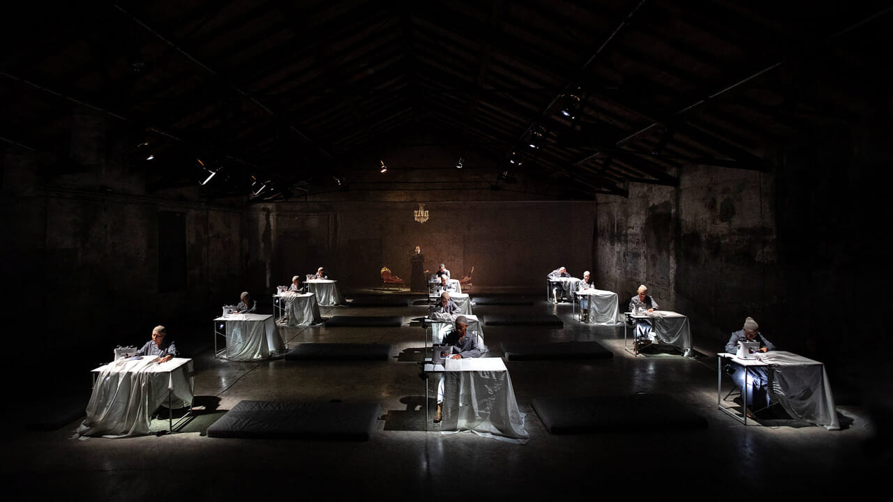 Lo spazio scenico è un opificio con 12 operaie tessili che denunciano una quotidianità di sfruttamento da parte di un Otello/padrone sullo sfondo, schermato, sorta di iconostasi drammaturgica. Imagoturgia la parola coniata da Francesco Pititto, autore del testo, che sintetizza Otello e Jago nella voce tenorile di Lorenzo Marchi, laddove Desdemona, ben lontana da una morte annunciata, paladina del riscatto – orgogliosa la collettiva ostensione finale del pugno sinistro -, è sdoppiata nella densa recitazione di Valentina Barbarini e nel canto robusto del soprano Giulia Costantini. Le voci cantano “a cappella”, adagiate su un tappeto sonoro elaborato da Andrea Azzali su materiale verdiano scelto da Adriano Engelbrech.