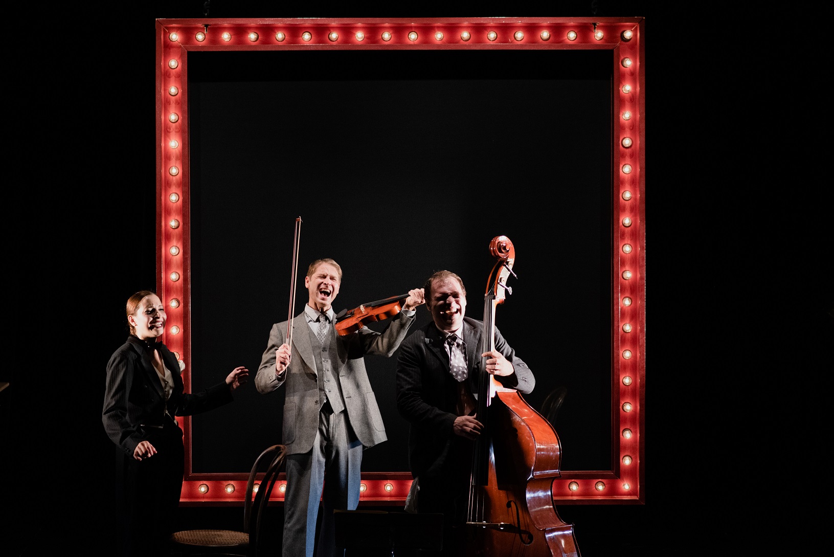 Nato da un attento e lungo lavoro di studio (tra questi il saggio di Antonella Ottai, Ridere rende liberi) e ricerca di testimonianze, elaborando quindi un testo per la costruzione drammaturgica (a cura di Damiano Nirchio e con gli attori della compagnia), lo spettacolo ha un impianto squisitamente cabarettistico evidente già dalla scenografia (di Pier Paolo Bisleri) che colloca i personaggi dietro le quinte di un teatrino, davanti a una grande cornice quadrata di lampadine e un vellutato sipario, e con alcuni oggetti disposti via via per l’uso: un tavolo, due sedie, un contrabbasso, un violino, e costumi di scena di volta in volta indossati e smessi nel susseguirsi delle azioni.