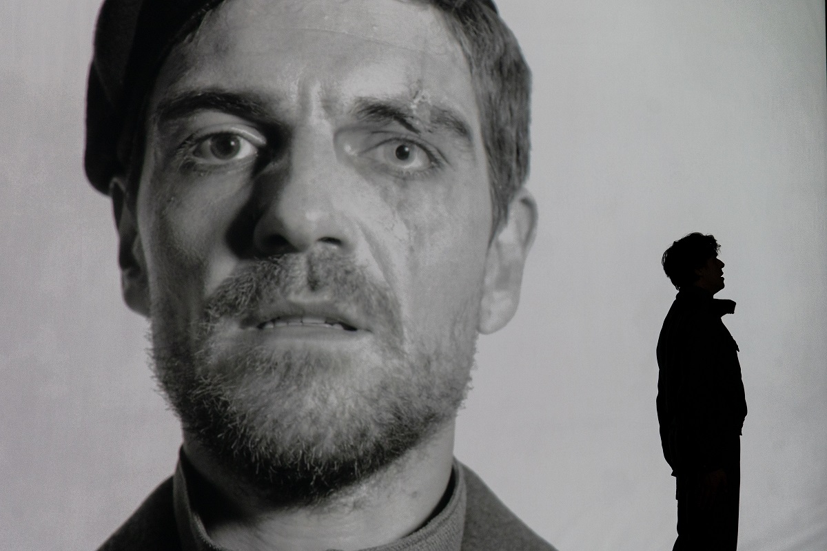 Attiva come videomaker documentarista, Le Moli ha portato in scena il suo linguaggio visivo, cinematografico, caratterizzando l’allestimento con ingegno creativo ed efficacia. Insieme a una scura parete frontale specchiante – che, illuminata dietro, svelerà l’interno di una stanza, si aprirà su una porta e dei corridoi -, due grandi schermi laterali supporteranno il racconto con proiezioni video di luoghi e persone in dialogo con gli interpreti tra memoria e presente. Le prime immagini, entrando in sala, accompagnate dalle musiche di Enrico Padovani ispirate ai paesaggi musicali di Erik Satie, sono quelle di volti giovanili in primissimo piano. Sono ragazzi del nostro tempo, per sintonizzarci con la storia di un giovane qualsiasi, senza nome, collocato in un “non luogo” e perciò in un’epoca sospesa. Il romanzo di Hovart, infatti, è ambientato in un momento non identificabile con nessuno dei due conflitti mondiali (che l’autore neanche vivrà), e perciò temporalmente collocabile in una guerra che potrebbe essere di ieri, di oggi, o di domani.