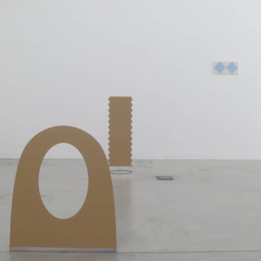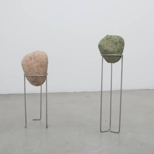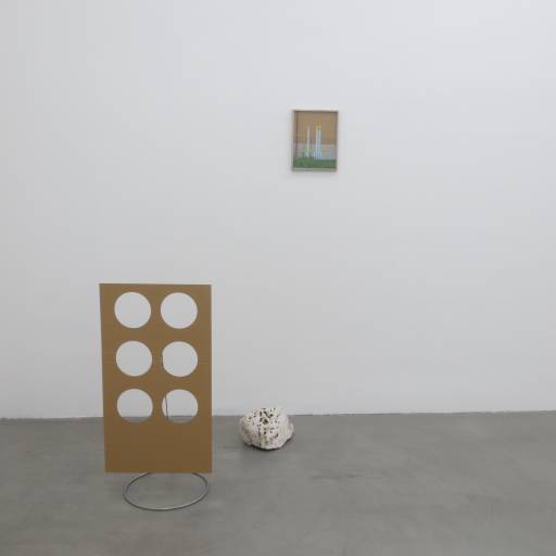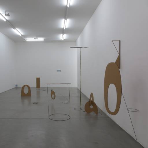 Pezzi di cartone sostenuti da lievi e leggere canne di bambù, sassi incastrati in gabbie di metallo come delle uova uscite da qualche cartone Disney, fotografie di paesaggi urbani che rompono il candido bianco delle pareti sono disposti come se fossero a una riunione, all’incontro domenicale tra compagni di vecchia data. E tu, ritardataria come al solito, interrompi quell’istante di perfetta serenità con il tuo arrivo e lo congeli, attirando verso la porta gli sguardi di tutti questi magici personaggi che lasci come pietrificati, proprio nell’istante di massima perfezione. E ti aggiri, nella sala del loro raduno, spiando da tutte le angolazioni i gruppetti che si sono creati, ascoltando i loro discorsi e guardando i loro gesti.